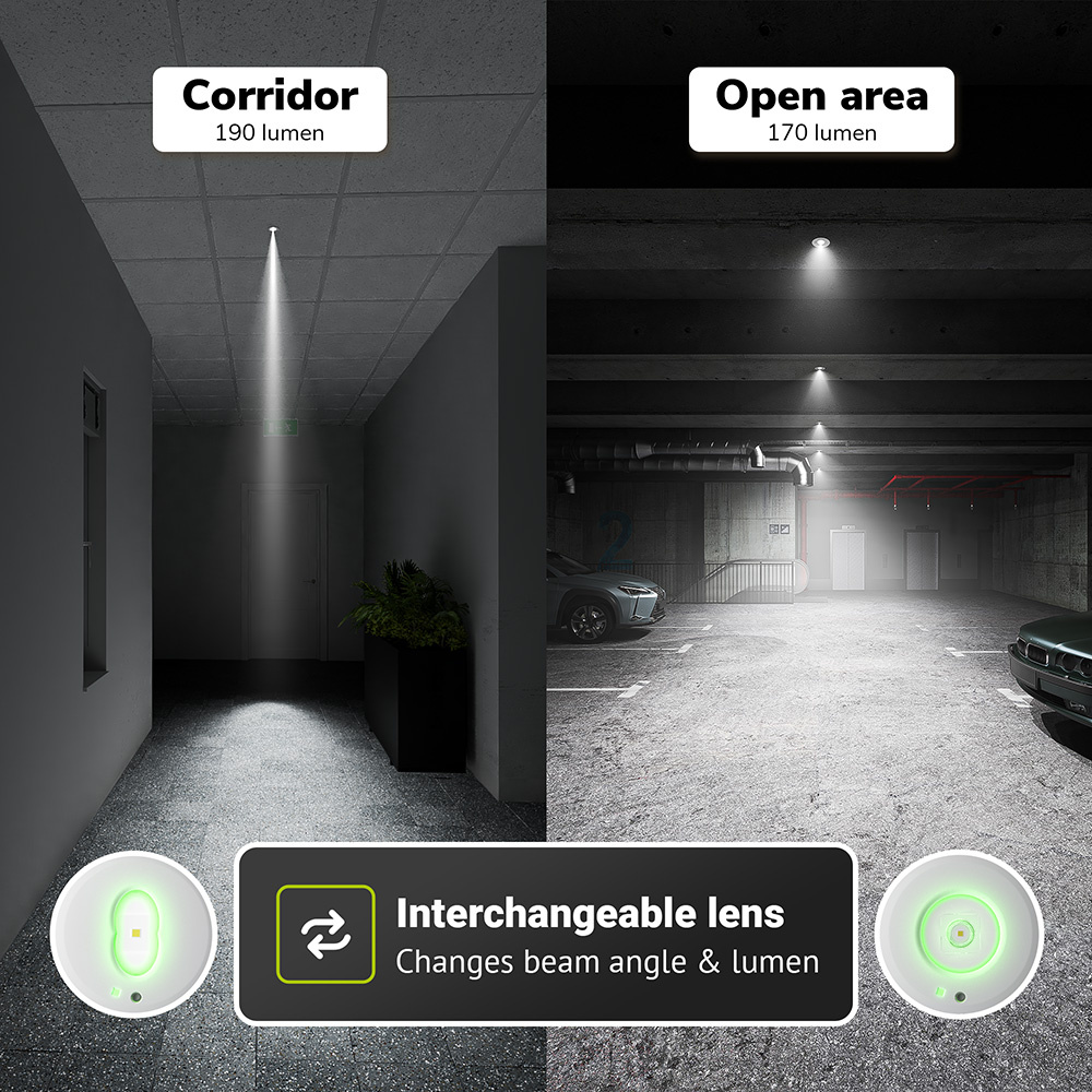 Het handige aan de Miran is dat hij wordt gebracht met verwisselbare lensen waarmee je de lichtopbrengst (het aantal lumen) en de stralingshoek kunt regelen. Wanneer je de inbouwspot in een forse ruimte wilt ruimtes gebruik je de standaardlens die zorgt voor een lichtopbrengst van 170 lumen. Voor plaatsing in gangpaden bedien je de meegeleverde lens met een smallere stralingshoek. Deze zorgt voor een lichtopbrengst van 190 lumen.