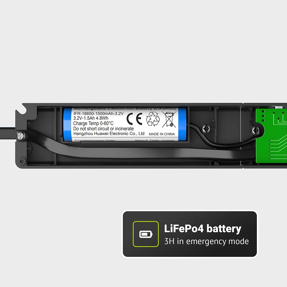 Als de stroom uitvalt en de verlichting niet meer werkt, hoef je je dankzij deze noodverlichting geen waken te maken. De Miran is uitgerust met een propere LiFePO4 back-up batterij die tot wel 3 uur kan branden. Deze batterij is binnen 24 uren volledig opgeladen. De noodverlichting schakelt automatisch in wanneer de stroom uitvalt. In gevaarlijke situaties zonder stroom zal de noodverlichting op de batterij blijven werken.
