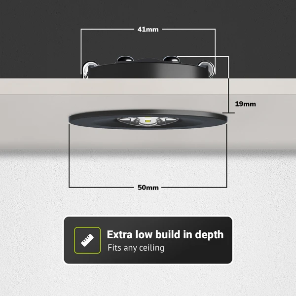 • Lage inbouwdiepte: De Miran heeft een lage inbouwdiepte van slechts 21 millimeter. Hierdoor kun je de noodverlichting inbouwspot in vrijwel iedereen plafond monteren.