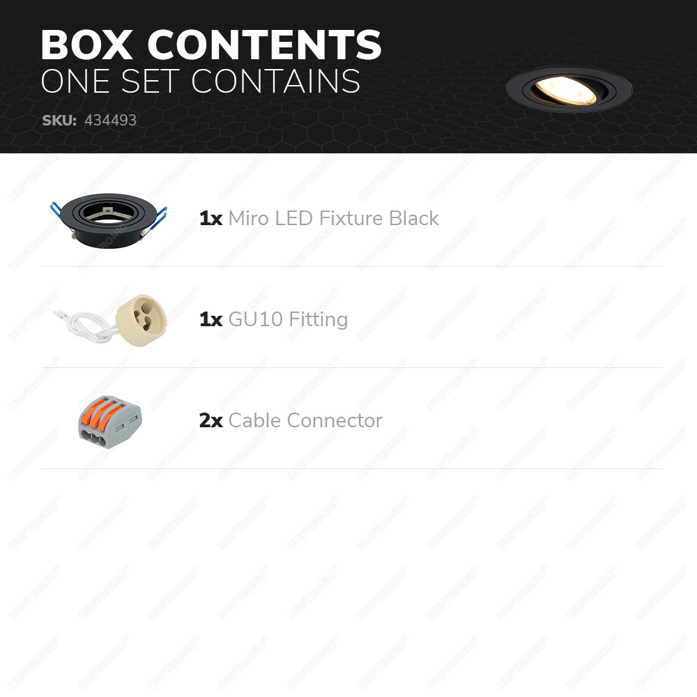 De Miro inbouwspot wordt vol overgedragen. Dit waakt ervoor dat je op de dag dat je het pakketje thuis krijgt onmiddelijk aan de slag kunt met de installatie. In de verpakking vind je de volgende items: