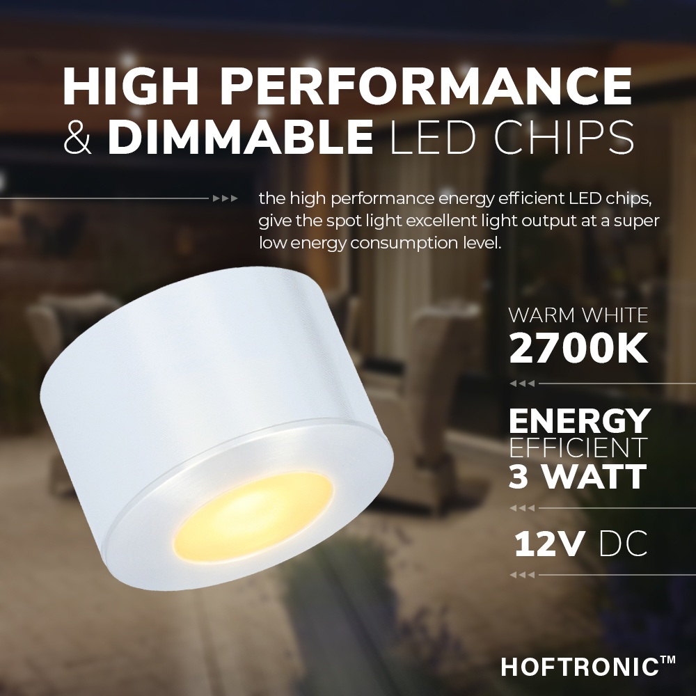 De Navarra LED opbouwspot verbruikt slechts 3 Watt en heeft een lichtopbrengst van 200 lumen. De opbouwspot heeft een extra warme witte lichtkleur van 2700K waardoor de ruimte een gemoedelijke ambiance krijgt. De lichtbundel van de opbouwspot is 45° hiermee kan de spot gericht objecten aanlichten. Deze Navarra opbouwspot is uitgevoerd in aluminium met een IP44 waarde waardoor de spot mede in het buitenbereik kan worden toegepast. De spot wordt standaard bezorgd met 15cm kabel met een mannetjes stekker en een 5 meter verlengkabel met vrouwtjes stekker zodat je de spot ten alle tijden kunt uitwisselen.