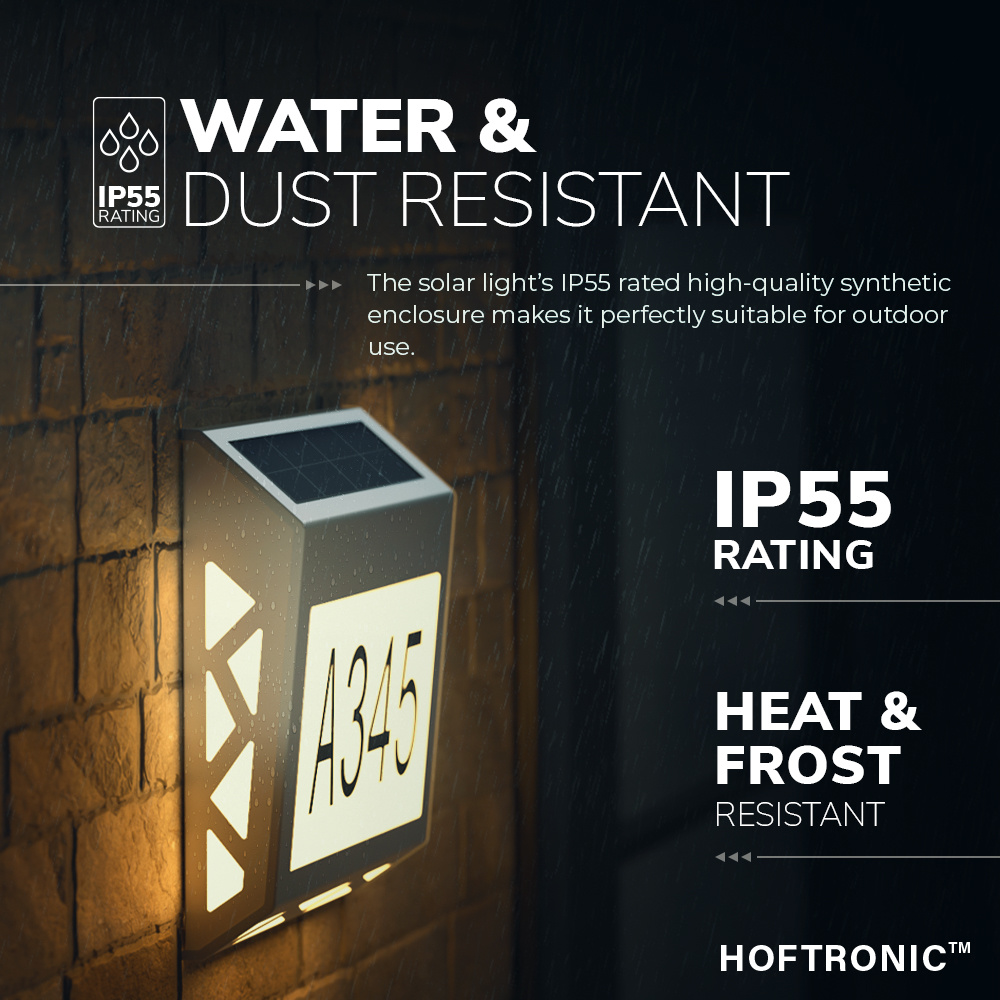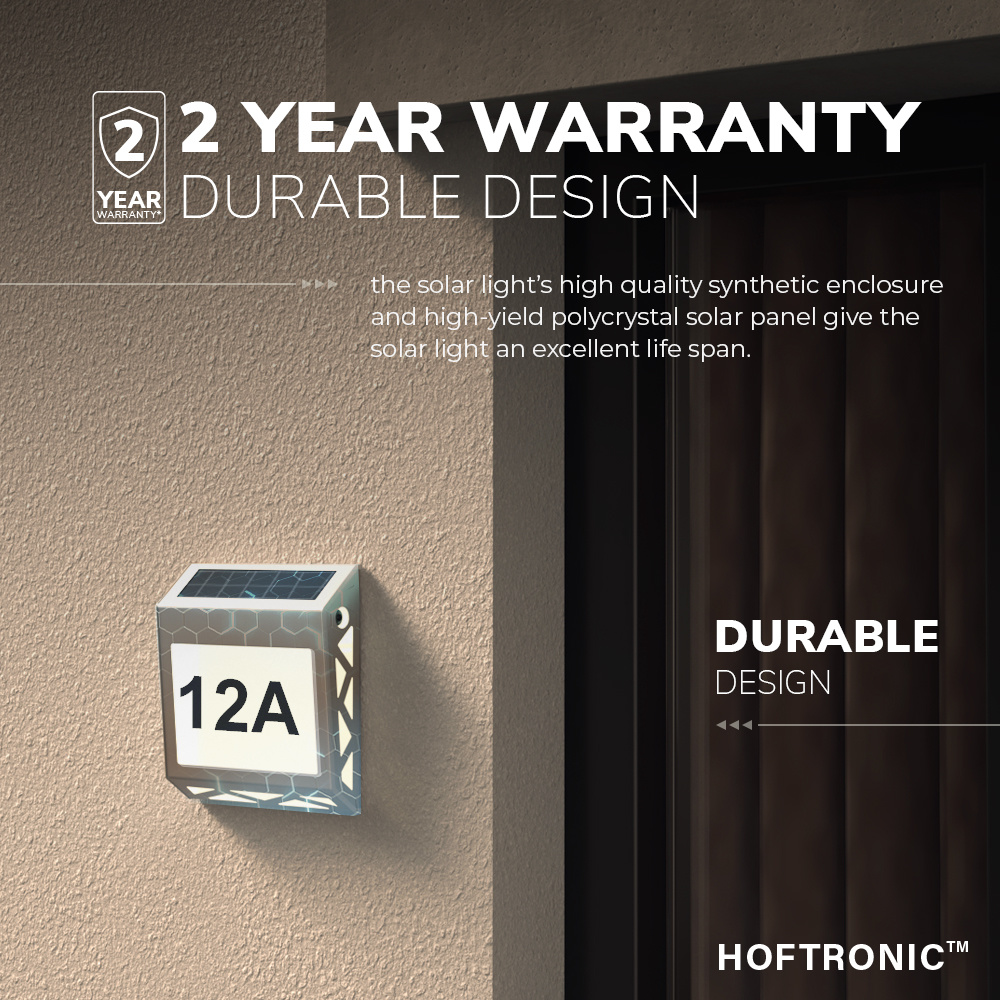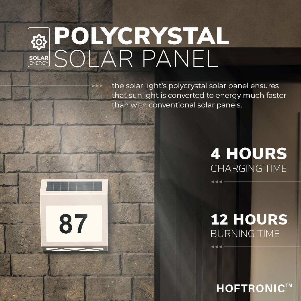 Deze LED solar huisnummer verlichting heeft een luxueuze hedendaagse look die nergens misstaat! Dankzij de Polykristal solar technologie is het knoeien met draden verleden tijd geworden. Met een oplaadtijd tussen de 4-6 uur brandt deze verlichting tot wel 12 uur aan een stuk!