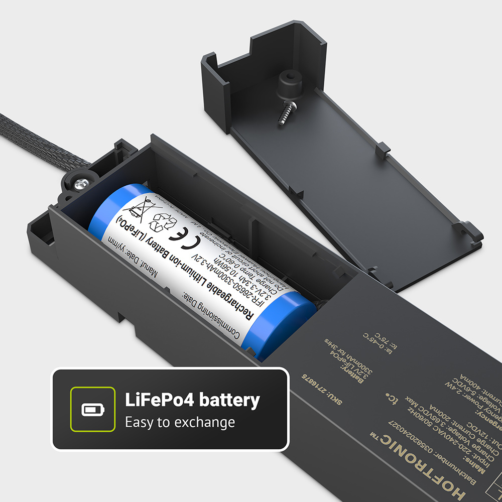 Als de stroom uitvalt en de verlichting niet meer werkt, hoef je je dankzij deze noodverlichting geen zorgen te maken. De Parvos is uitgerust met een goede LiFePO4 3.2V 3300mAh back-up batterij die tot wel 3 uur kan branden. Deze batterij is binnen 24 uren perfect opgeladen. De noodverlichting schakelt automatisch in wanneer de stroom uitvalt. In gevaarlijke situaties behalve stroom zal de noodverlichting op de batterij blijven werken.