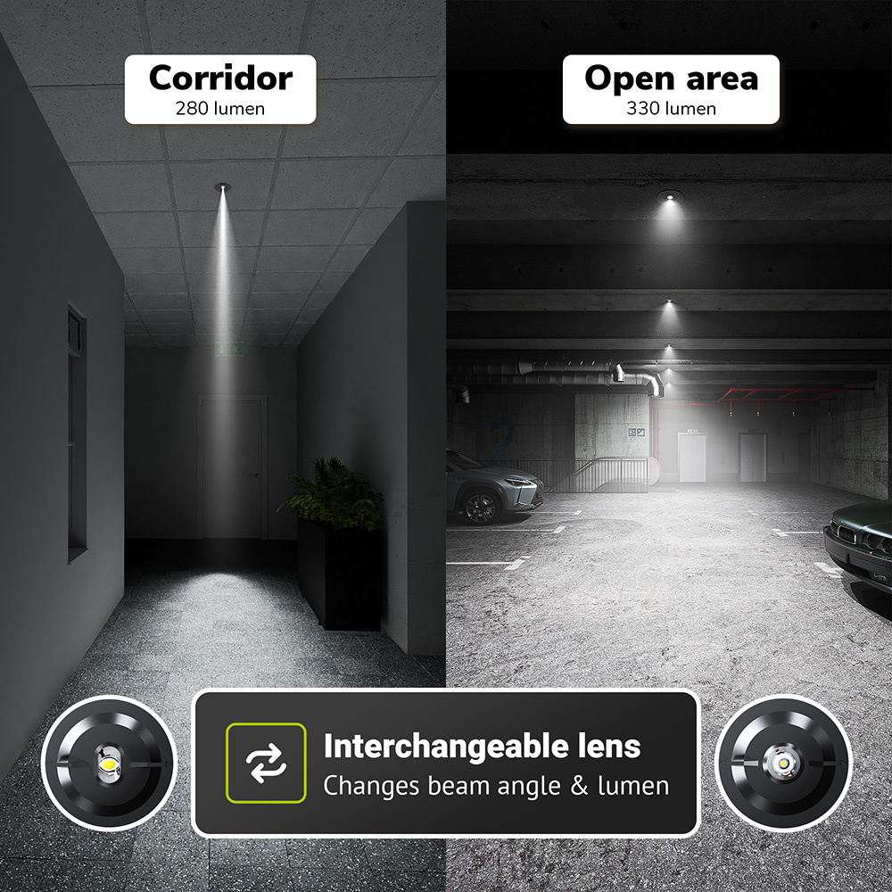 Het handige aan de Parvos is dat hij wordt geleverd met verwisselbare lensen waarmee je de lichtopbrengst (het aantal lumen) en de stralingshoek kunt vaststellen. Wanneer je de inbouwspot in een grote ruimte wilt plaatsen, bedien je de standaardlens die zorgt voor een lichtopbrengst van 330 lumen. Voor plaatsing in gangpaden hanteer je de meegeleverde lens met een smallere stralingshoek. Deze zorgt voor een lichtopbrengst van 280 lumen.