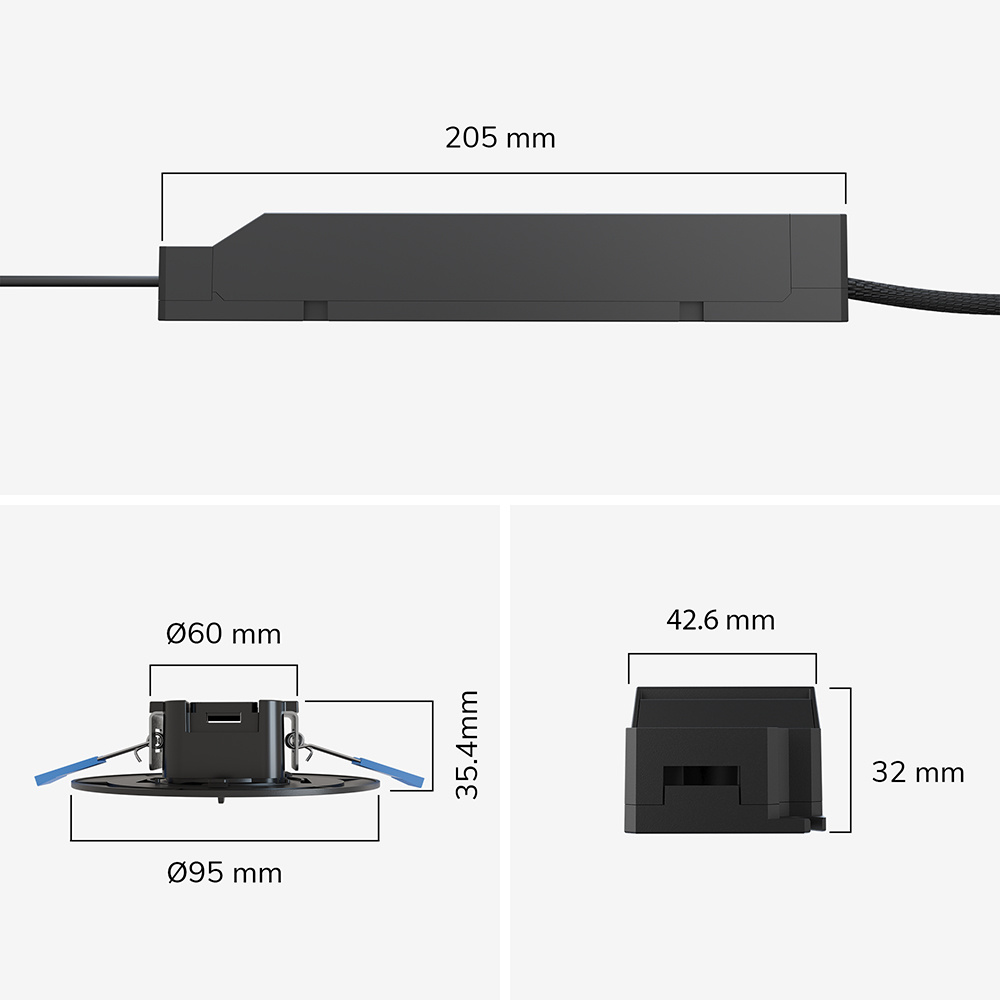 | Afmetingen | Inbouwspot Ø95 x 35,4 mm / Driver 205 x 42,6 x 32 mm |
