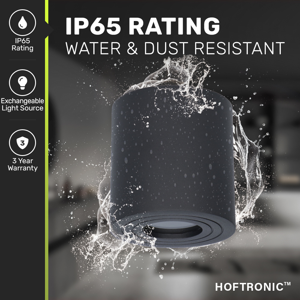 Deze bouw plafondspot Paxton heeft een kwalitatieve aluminium finish in de kleur zwart. Het armatuur is naadloos gefinaliseerd en hierdoor voorzien van een IP65 waterdichtheid. De 6 staat voor de stofdichtheid van de lamp. In dit geval betekent dit dat de lamp ideaal stofdicht is. De 5 staat voor de waterdichtheid van de plafondspot. De IP65 beschermingsklasse garandeert je dus dat je de plafondspot met een gerust hart in een zeer vochtige ruimte kunt plekken. Installeer het spotje boven de wasbak, bad of douchecabine in de badkamer, in de woonkamer of verlicht je carport / overkapping.