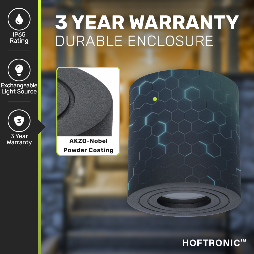 Op zoek naar een hedendaagse ronde plafondspot voor de badkamer of keuken? Kies dan voor deze Paxton opbouwspot. De plafondspot is voorzien van een IP65 beschermingsklasse en ontwikkeld van onderhoudsvrij aluminium. Hierdoor zal de plafondspot niet roesten en zijn defecten door vocht uitgesloten. De Paxton heeft een mat zwarte kenmerk, welke niet reflecteert. De mat zwarte spots staan stijlvol en modern op een hagelwit plafond. Uiteraard zorgt de hoge beschermingsklasse ervoor dat de plafondspots mede goed zijn voor buiten.