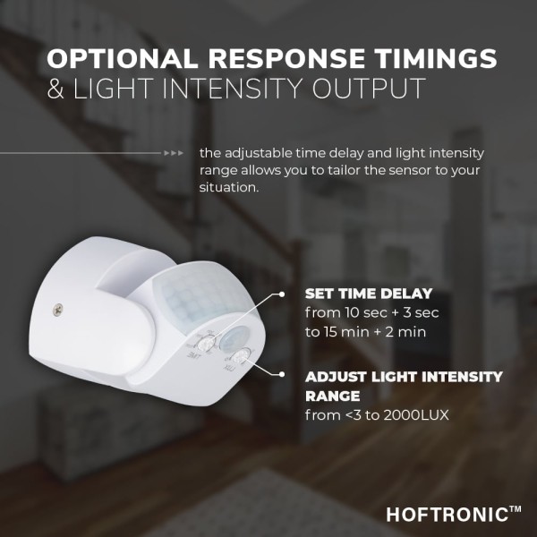 Ook de bewegingssensor is compleet instelbaar. Deze werkt via de “TIME” draaischijf en behoort de vertragingstijd aan. Deze kun je instellen op een waarde tussen de 3 seconde, en 15 minuten. De vertragingstijd geeft aan hoe lang de aangesloten lampen blijven branden na het detecteren van bewegingen.