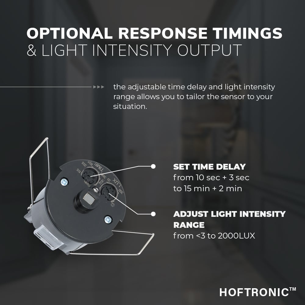 De bewegingssensor stel je in aan de hand van de vertragingstijd. De vertragingstijd geeft aan hoe lang de aangesloten lampen blijven branden na het detecteren van een beweging. Deze kun je instellen in de volgende settings: 10 seconde, 30 seconde, 1,5 minuut, 3 minuten, 7 minuten en 15 minuten. De kleine settings hanteer je bijvoorbeeld als beveiligingsverlichting. De setting van 15 minuten is perfect voor kantoren en vergaderruimtes. Hierdoor blijven de lampen altijd aan wanneer er volk in de ruimte zijn. De setting van 2 minuten zou je bijvoorbeeld kunnen gebruiken bij installatie in een toiletruimte.