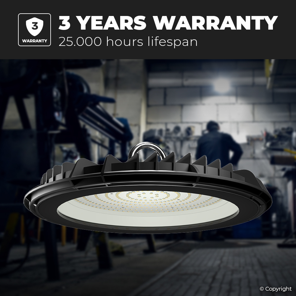 De High bay Pluto biedt maar liefst 25.000 branduren. Dagelijks mag hij 10 tot maximaal 12 uur branden. Dit komt neer op gemiddeld 10 jaar plezier van jouw High bay bij extreem gebruik. Mocht er toch iets defect gaan aan de High bay dan biedt Hoftronic 3 jaar garantie.