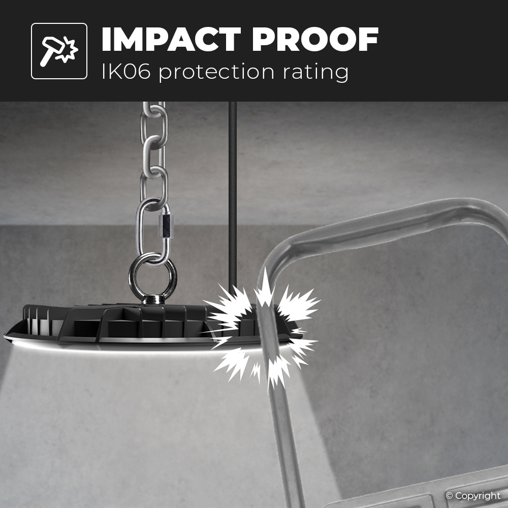 Door de IK06 waarde van dit product is deze High bay bestand tegen schokken van 1 Joule. Bij zakelijk gebruik of in professionele plekken dient verlichting genoeg bestand te zijn tegen een stootje onder andere bij deze hoogstralers. In welke mate een armatuur bestand is tegen een ongelukje wordt aangeduid in een IK waarde. Met IK06 heeft de High bay Pluto een hoge weerstandsclassificatie. Dit vertaalt zich in de voordelen dat het item juist is om te benuttigen in magazijnen, bedrijfshallen, fabriekshallen, werkplaatsen, maneges etc.