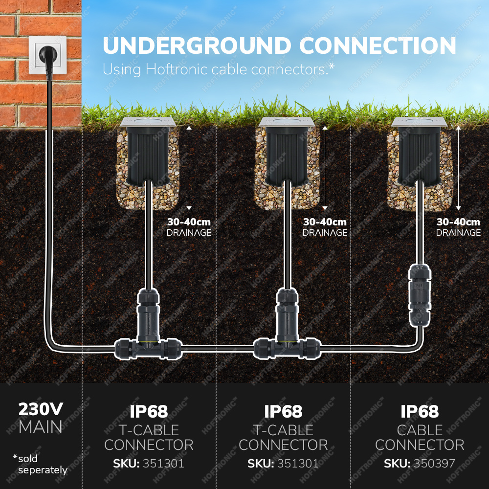Je hoeft enkel door middel van de waterdichte kabelverbinder de grondspots te koppelen aan de stroomkabel van de netvoeding. Hiervoor heb je geen transformator voor nodig. Het aansluiten van de tuinspots is nu een fluitje van een cent! (Let op deze zijn niet inbegrepen)