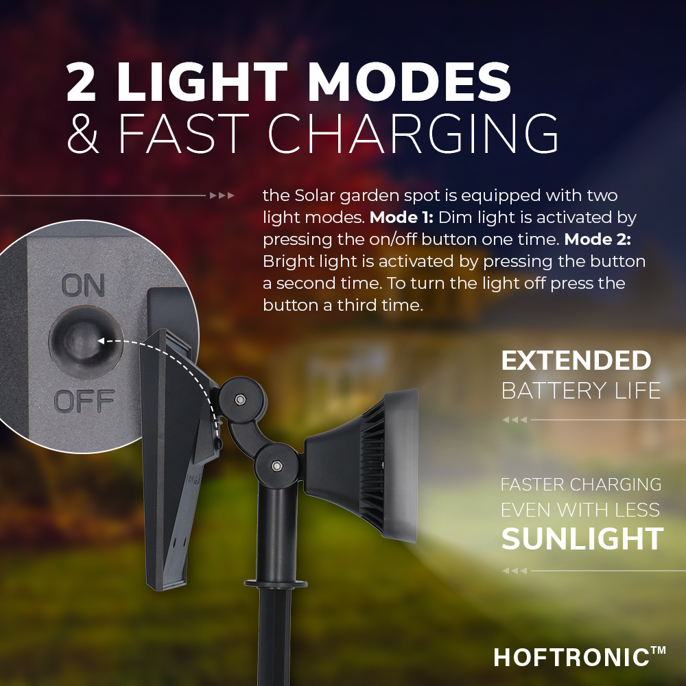 De Reno Solar tuinspot is voorzien van de nieuwste LED Chip technologieën. Dit zorgt ervoor dat je de lichtsterke (lumen) van deze spot zelf kunt instellen. De Solar tuinspot is voorzien van twee lichtmodi. De eerste lichtmodus is voor het uitlichten van objecten die ver van de spot staan. In deze lichtmodus schijnt de Solar tuinspot met een lichtsterkte van 200 lumen. Voldoende voor het van licht voorzien van een beeld in de tuin, een vlaggenmast of zelfs een boom. De tweede lichtmodus is voor het van licht voorzien van objecten die dichterbij staan. In deze lichtmodus heeft de tuinspot een lichtsterkte van 100 lumen. Logischerwijs heeft het instellen van de hechtheid van de solar tuinspot een effect op de arbeidstijd van de tuinspot. In modus 1 heeft een werktijd van Max. 6 uur en Modus 2 heeft een werktijd van Max. 10 uur.
