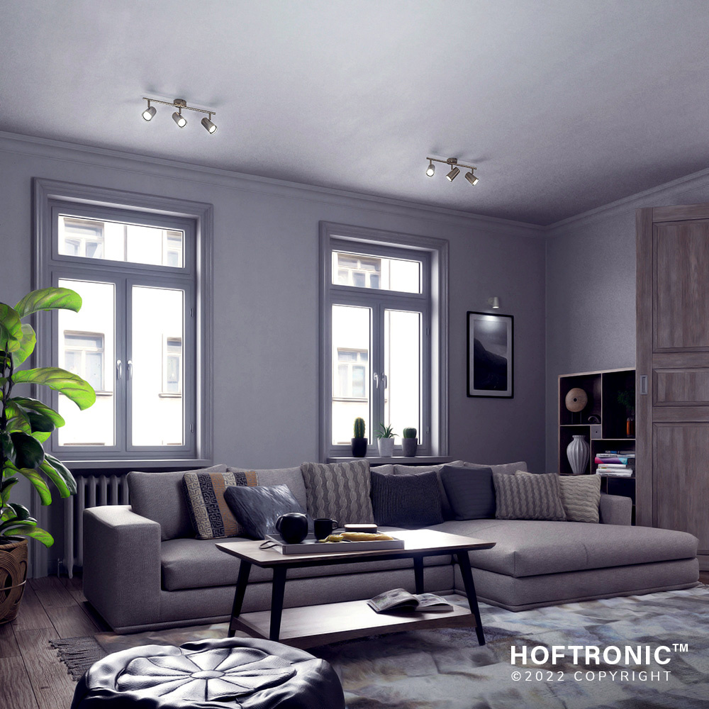 De fitting in de drie spotjes is een GU10 fitting. Dit betekent dat jij naar wens een lichtbron kan plaatsen en wanneer deze defect is vervang je hem aangenaam zelf voor een nieuwe spot. Wil jij je kamer graag met zomers wit licht verlichten of met koel wit licht? Het is allemaal geen dilemma. Wij bieden zelfs smart GU10 spots met RGBWW licht aan, zodat jij van Riga een slimme plafondlamp kunt maken. Stel je licht in op een van de zestien.5 miljoen kleuren uit onze Hoftronic Smart app, stel tijdschema’s in en nog veel meer.