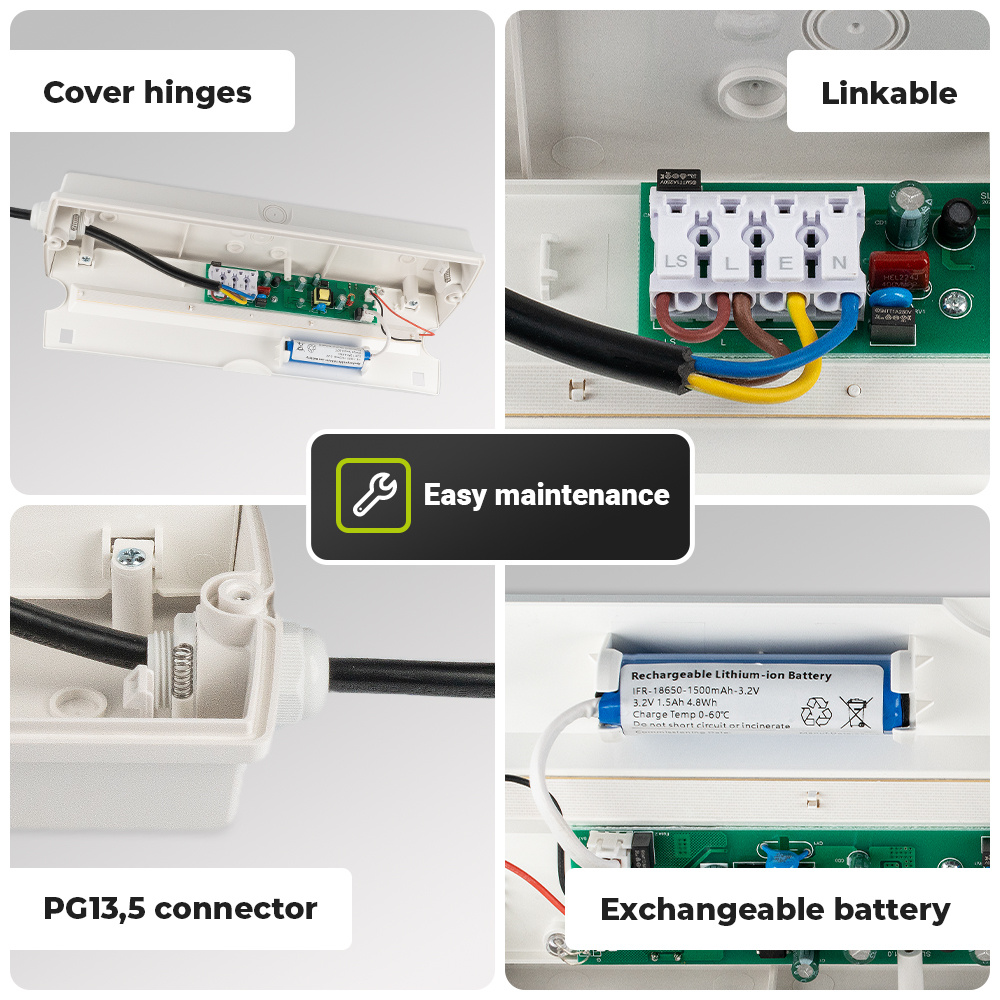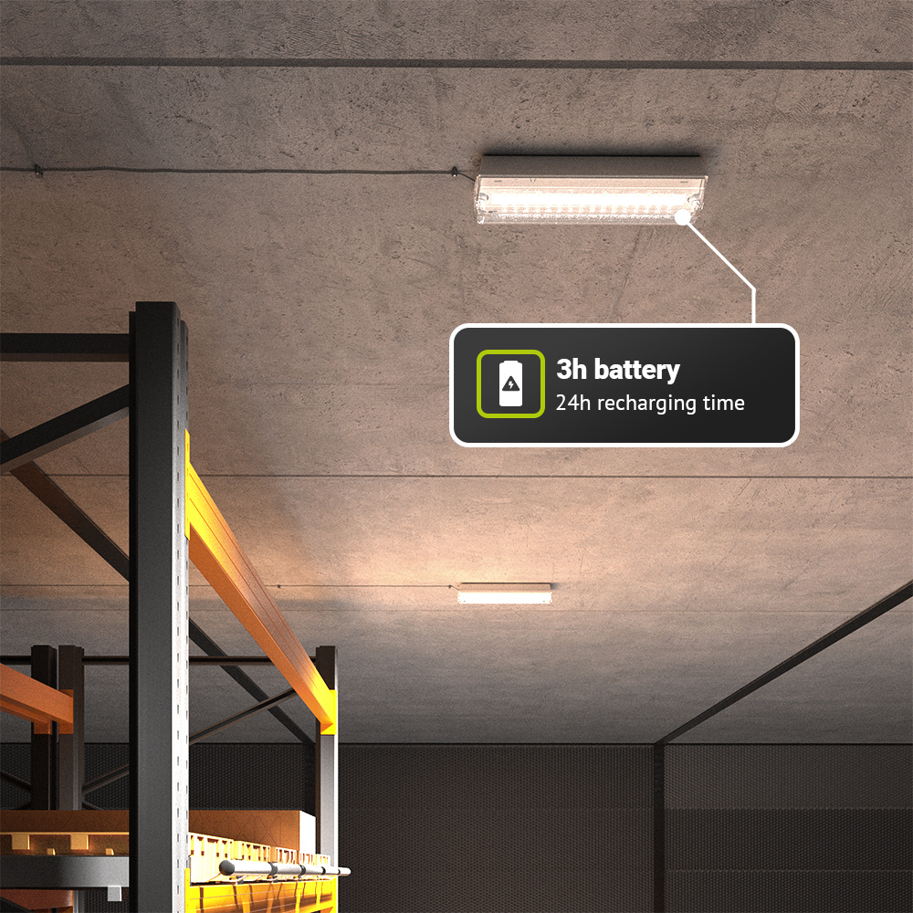 Als de stroom uitvalt en de verlichting niet meer werkt, hoef je je dankzij deze noodverlichting geen zorgen te maken. De Salus is uitgerust met een goede LiFePO4 back-up batterij die tot wel 3 uur kan branden. Deze batterij is binnen 24 uren volmaakt opgeladen. De noodverlichting schakelt automatisch in wanneer de stroom uitvalt. In gevaarlijke situaties zonder stroom zal de noodverlichting op de batterij blijven werken.
