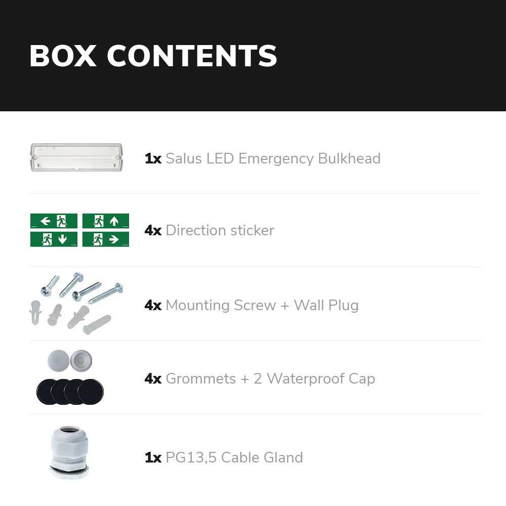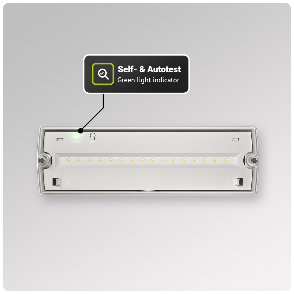 De Salus is een professionele noodverlichting die je zowel aan de wand als aan het plafond kunt monteren met of zonder vluchtwegaanduiding. De noodverlichting heeft een handige autotest-functie. Dit betekent dat de lamp zichzelf elke maand en eenieder jaar automatisch test. Wanneer de lamp niet meer geschikt functioneert, gaat er een rode led-indicator branden of knipperen. Dit is niet alleen optimaal voor de veiligheid, maar doordien je de lamp niet meer elke maand handmatig hoeft te testen, scheelt dit ook een hoop tijdsruimte. De Salus wordt bezorgd incl. 4 allerlei vluchtrichting-stickers zodat je de lamp op elke gewenste plek kunt ophangen. Deze noodverlichting schijnt een 6500K daglicht wit licht en heeft een lichtopbrengst van 160 lumen. Hiermee is hij is in alle situaties juist zichtbaar en dat ondanks een verbruik van slechts 3,5 watt.