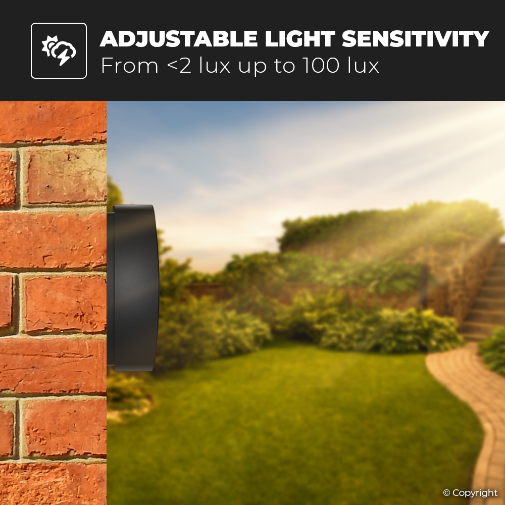 - Photocell technologie: Deze photocell technologie zorgt ervoor dat aangesloten lampen allemaal tegelijk aanspringen. Ideaal wanneer je grote groepen lampen op deze sensor wilt aansluiten.