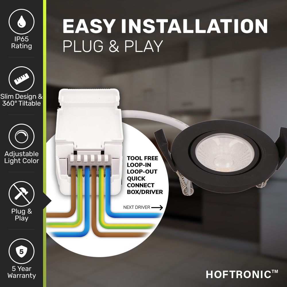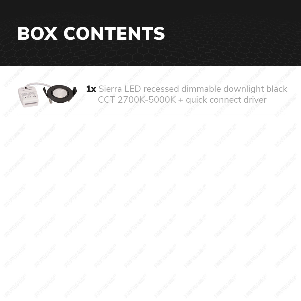 Doordat zowel de spot als de transformator dezelfde grootte hebben, kunnen deze bij de installatie door hetzelfde gat. Dit is vooral belangrijk bij inbouwspots met een zeer lage inbouwdiepte, zoals deze Sierra (27mm). De transformator is gereedschapsloos aan te sluiten. Geen geknoei met schroevendraaiers of kroonsteentjes, maar echt vol plug and play.