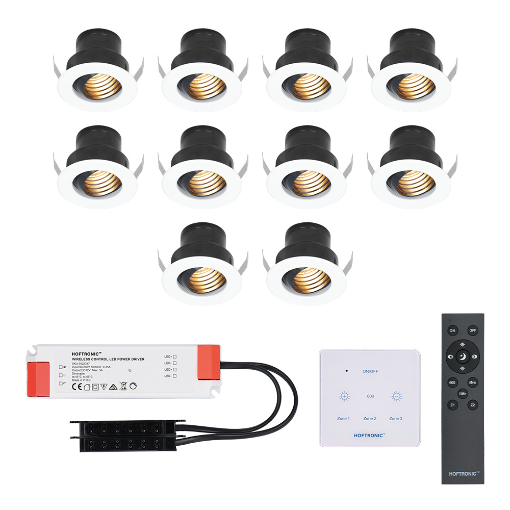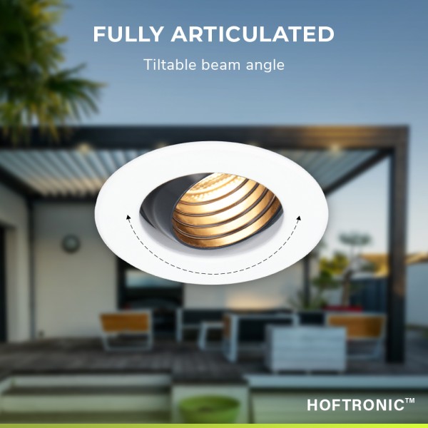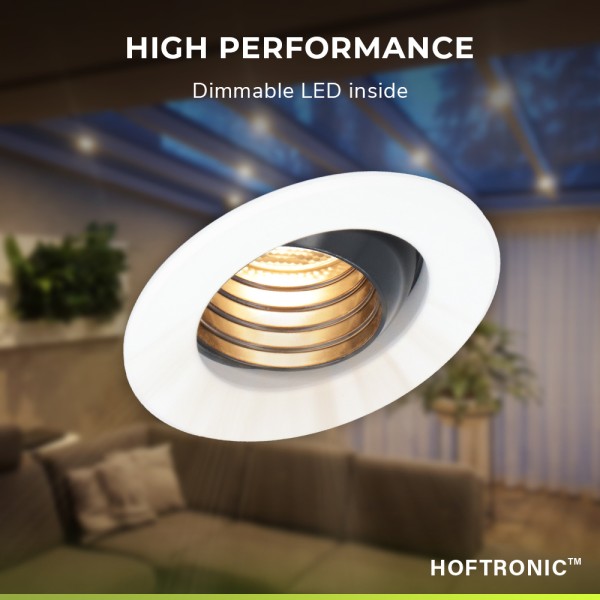 De Hoftronic Medina dimbare inbouwspot zijn traploos dimbaar, wat betekent dat je in een vloeiende overgang van 100% naar 0% kunt dimmen, en omgekeerd. De kleurtemperatuur is 2700K, wat staat voor warm wit licht. Er wordt een afstandsbediening bij overgedragen. Zit je kostelijk in je luie stoel op de veranda, of lig je languit in bad en denk je: de verlichting staat toch iets te fel? Met de afstandsbediening dim je de verlichting meteen, en hoef je dus niet op te staan. Ideaal.