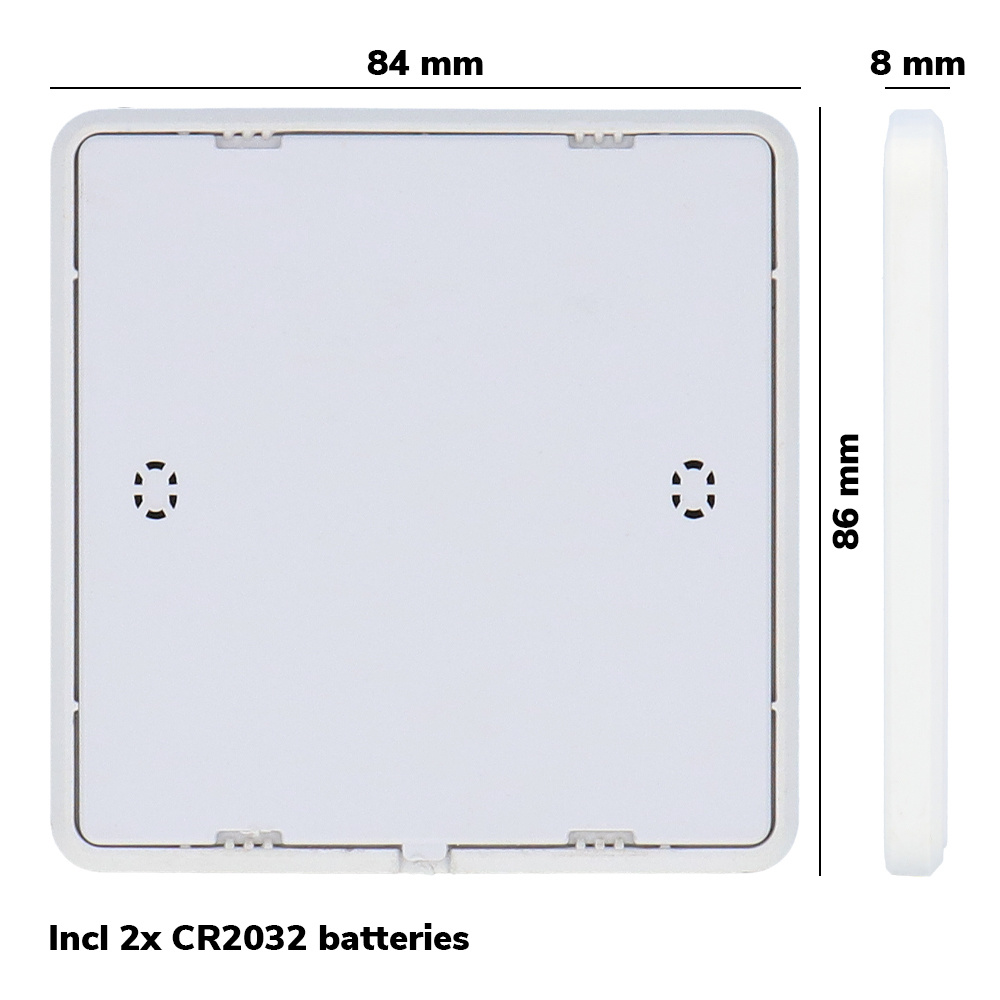 De dimmer heeft een smal en zeer modern ontwerp, een detectieafstand van 20 meter, een grootte van 86 x 86 x 8 mm en bezit over een touch panel behalve knoppen voor ultiem gemak. Met de meegeleverde knoopcelbatterijen is de dimmer volkomen draadloos en kun je deze monteren waar je wil!