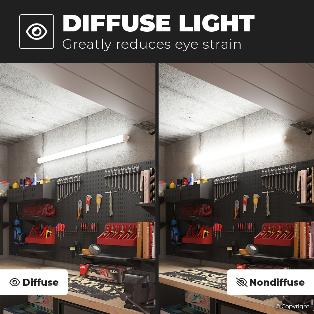 Dit waterdichte LED TL armatuur is gemaakt van ondoorzichtig kunststof waardoor het armatuur een diffuus licht schijnt. Dit heeft landelijk als flinke voordeel dat je niet verblindt wordt wanneer je meteen in de lamp kijkt. Daarnaast verdeelt de lamp hierdoor zijn licht leuker en is de gehele grootte van de LED balk verlicht.
