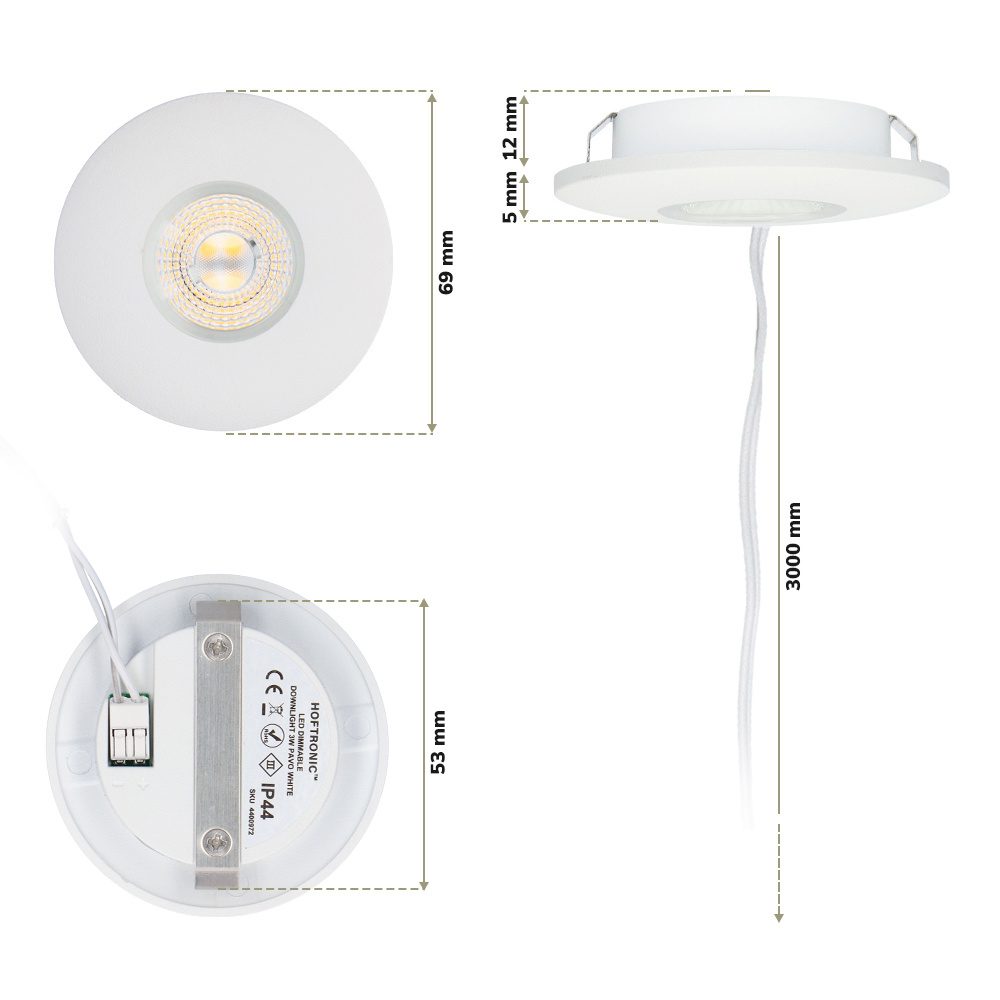 De Pavo wit downlights zijn zeer energiezuinig met een energieverbruik van slechts drie Watt, en hebben een hoge lichtopbrengst van 260 lumen. De Pavo wit downlight is dimbaar en is dus in de lichtsterkte naar beslissing in te stellen. In het armatuur van de downlights zijn LED chips geïntegreerd. Dit wil zeggen dat er geen verwisselbare LED bron in het armatuur verwerkt zit. De levensduur van de LED downlight Pavo wit is 50.000 branduren. Tevens zit er bij elke spot een kabel van drie meter meegeleverd. Je hebt dus meerdere jaren lang genot van de Pavo wit LED downlight.