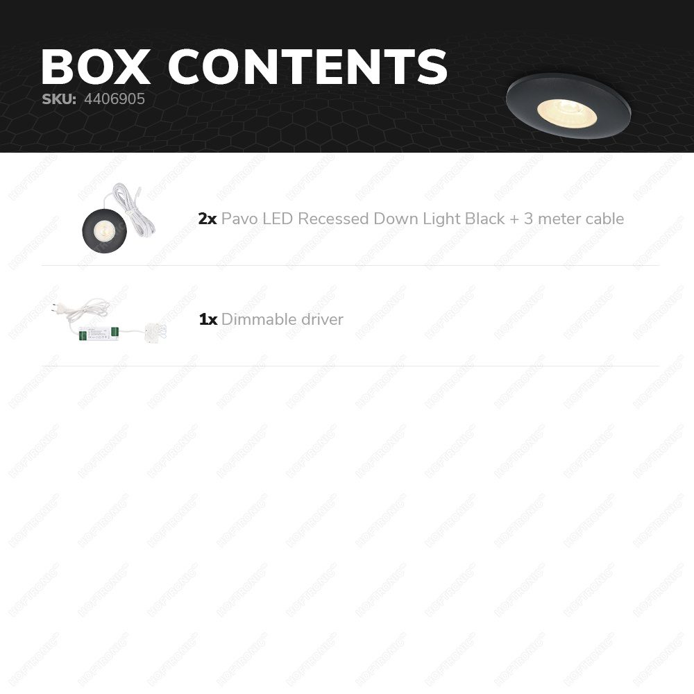 De Pavo zwart downlights zijn zeer energiezuinig met een energieverbruik van slechts drie Watt, en hebben een hoge lichtopbrengst van 260 lumen. De Pavo zwart downlight is dimbaar en is dus in de lichtsterkte naar beslissing in te stellen. In het armatuur van de downlights zijn LED chips geïntegreerd. Dit wil zeggen dat er geen verwisselbare LED bron in het armatuur verwerkt zit. De levensduur van de LED downlight Pavo zwart is 50.000 branduren. Tevens zit er bij elke spot een kabel van drie meter meegeleverd. Je hebt dus meerdere jaren lang schik van de Pavo zwart LED downlight.