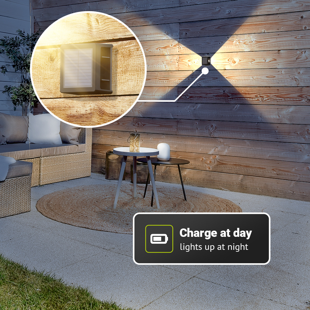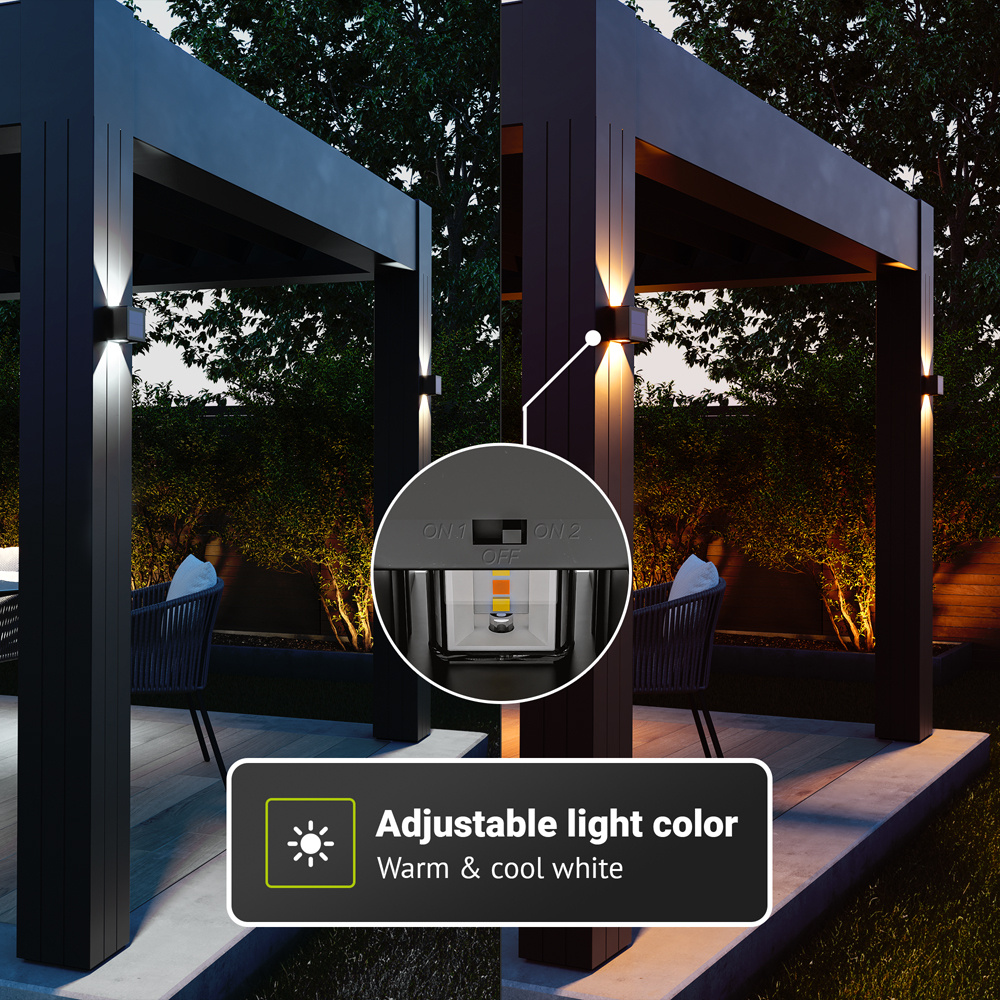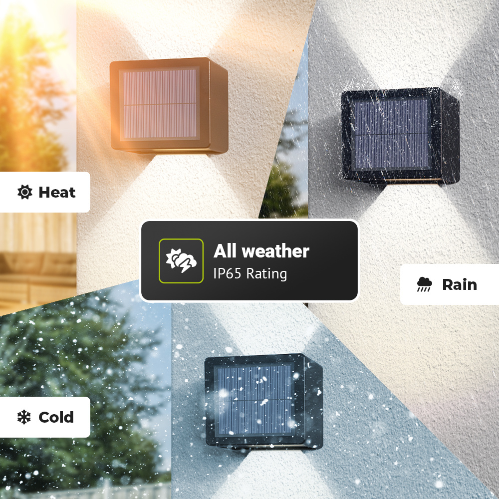 Deze Louis solar wandlamp schijnt zijn licht zowel naar boven als naar beneden. Beide lichtbundels zijn algeheel traploos instelbaar via de instelbare vleugels bij de LEDs. Aan de onderkant van de lamp zit een schakelaar waarmee je moeiteloos de lichtkleur van de solar wandlamp aan kunt passen. De naadloze finish zorgt ervoor dat de Louis IP65 waterdicht is. Je kunt de lamp dus gerust het hele jaar buiten laten hangen.