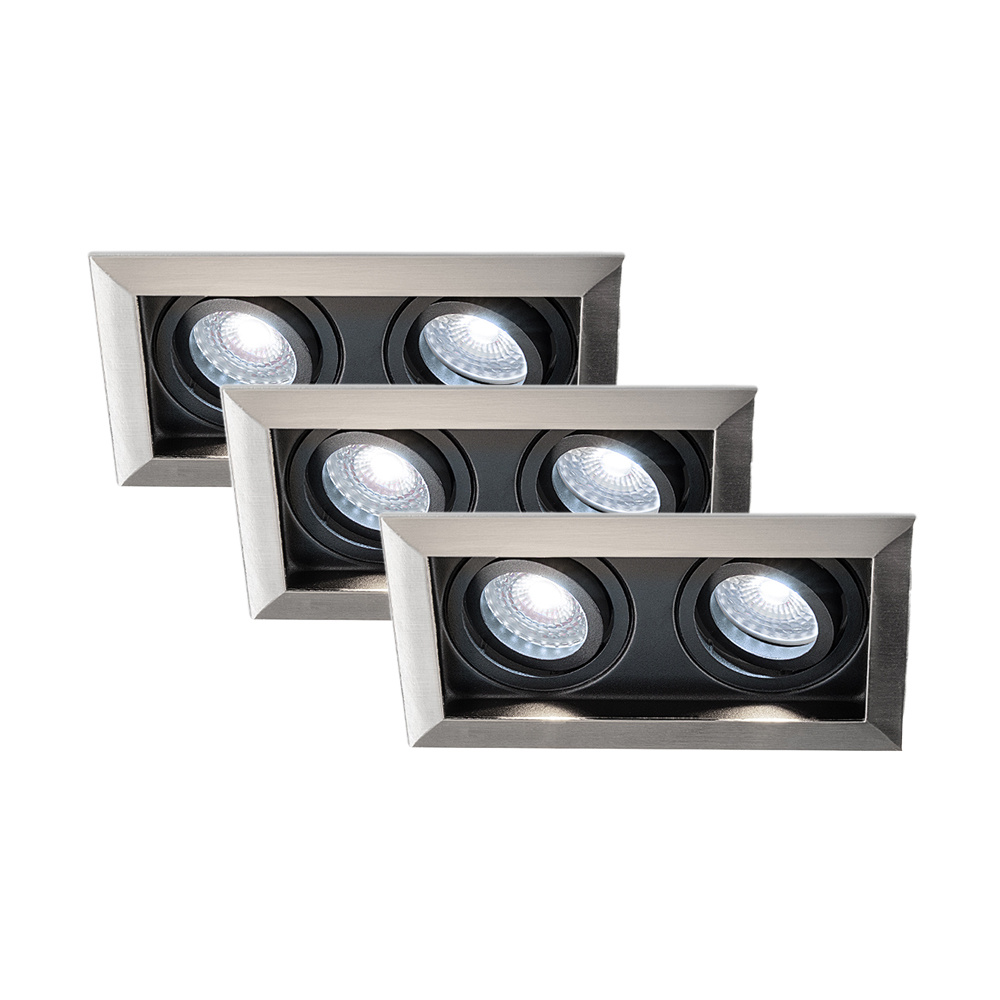 De set van 3 Durham Dubbel RVS inbouwspots zijn inbouwspots met 2 GU10 fittingen. De armaturen zijn betrouwbaar als inbouwspot voor je plafondverlichting. Door de handige GU10 fitting draai je moeiteloos en binnenkort elke lichtkleur GU10 lamp in je inbouwspots. De armaturen zijn vervaardigd van een grondig en stevig onderhoudsvrij aluminium.
