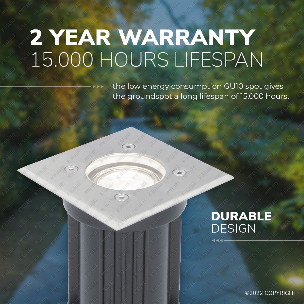 Deze grondspots zijn gemaakt in betrouwbaar onderhoudsarm geborsteld RVS. De grondspot is voorzien van een GU10 fitting. Ideaal voor het verlichting van planten, bomen, terras, oprit en binnenplaatsen. Deze grondspot is van zéér stevige kwaliteit en is zelfs juist om in beloopbare gebieden te worden bevestigd en heeft maar liefst een IP65 beschermingsklasse waarmee deze grondspot waterdicht is (niet bruikbaar voor onder water!).