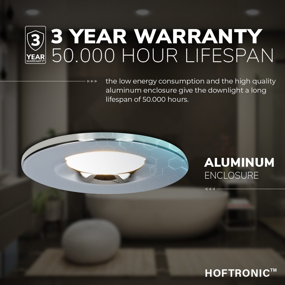 Deze Venezia LED inbouwspot heeft een kwalitatieve afwerking van aluminium. Daarnaast is de inbouwspot IP65 waterdicht en stofbestendig. Ideaal voor bedien in vochtige ruimtes maar mede voor buiten in het afdak! Een ander fraaie eigenschap is dat deze Venezia inbouwspot 90 minuten brandbestendig gecertificeerd is, dit wilt zeggen dat je tegen nattigheid en brand een ultra behoorlijke maar keurige inbouwspot hebt. De LED inbouwspots zijn dus zeer bekwaam voor utiliseer in natte ruimtes als in de badkamer, boven een douche of bad, maar ook voor buitengebruik. Denk onder andere aan terrasverlichting in het afdak. De Venezia badkamer inbouwspot vervangt je huidige 50 Watt halogeen lamp. Ook de warme lichtkleur wordt 1 op 1 overgenomen van de orginele halogeenlamp. De Venezia inbouwspot heeft namelijk bovendien een egaal heet wit licht waarmee de ruimte een keurige, warme sfeer krijgt. Met de dim-to-warm inbouwspot kan je de spot dimmen waarbij de lichtkleur nog warmer wordt, perfect voor de warme momenten. De uiteenlopende lichtbundel van deze spot zorgt voor een vloeiende overgang van het licht, waardoor bij het gebruik van meerdere spots de lichtbundels elkaar overlappen en er geen donkere plekken ontstaan.