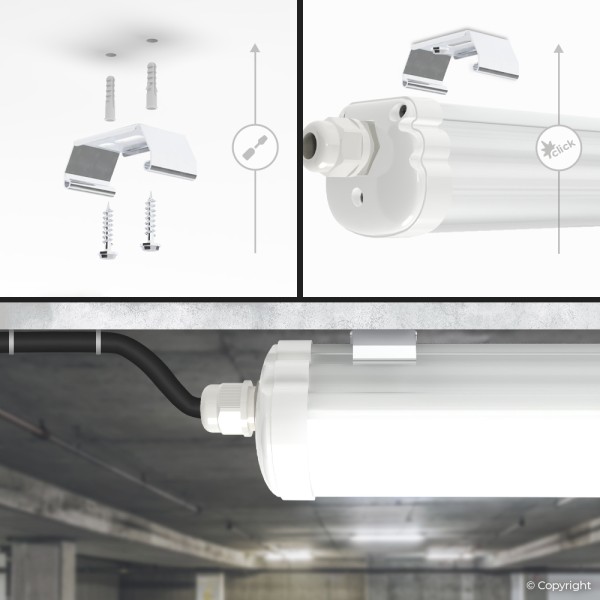 Door middel van de RVS montageclips klik je het armatuur comfortabel tegen het plafond. Deze is er vervolgens ook aangenaam af te halen. Hierdoor kun je het armatuur comfortabel schoonmaken. Dit waterdichte LED TL armatuur kun je onmiddelijk op het 230 volt lichtnet aansluiten.