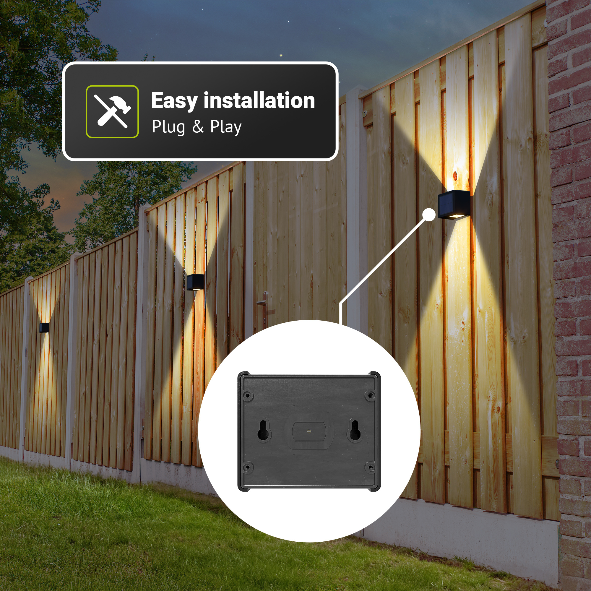 Deze Louis solar wandlamp schijnt zijn licht zowel naar boven als naar onder. Beide lichtbundels zijn vol traploos instelbaar via de instelbare vleugels bij de LEDs. Aan de onderkant van de lamp zit een schakelaar waarmee je moeiteloos de lichtkleur van de solar wandlamp aan kunt horen bij. De naadloze finish zorgt ervoor dat de Louis IP65 waterdicht is. Je kunt de lamp dus gerust het hele jaar buiten laten hangen.