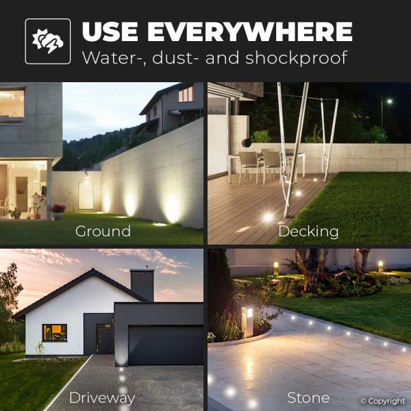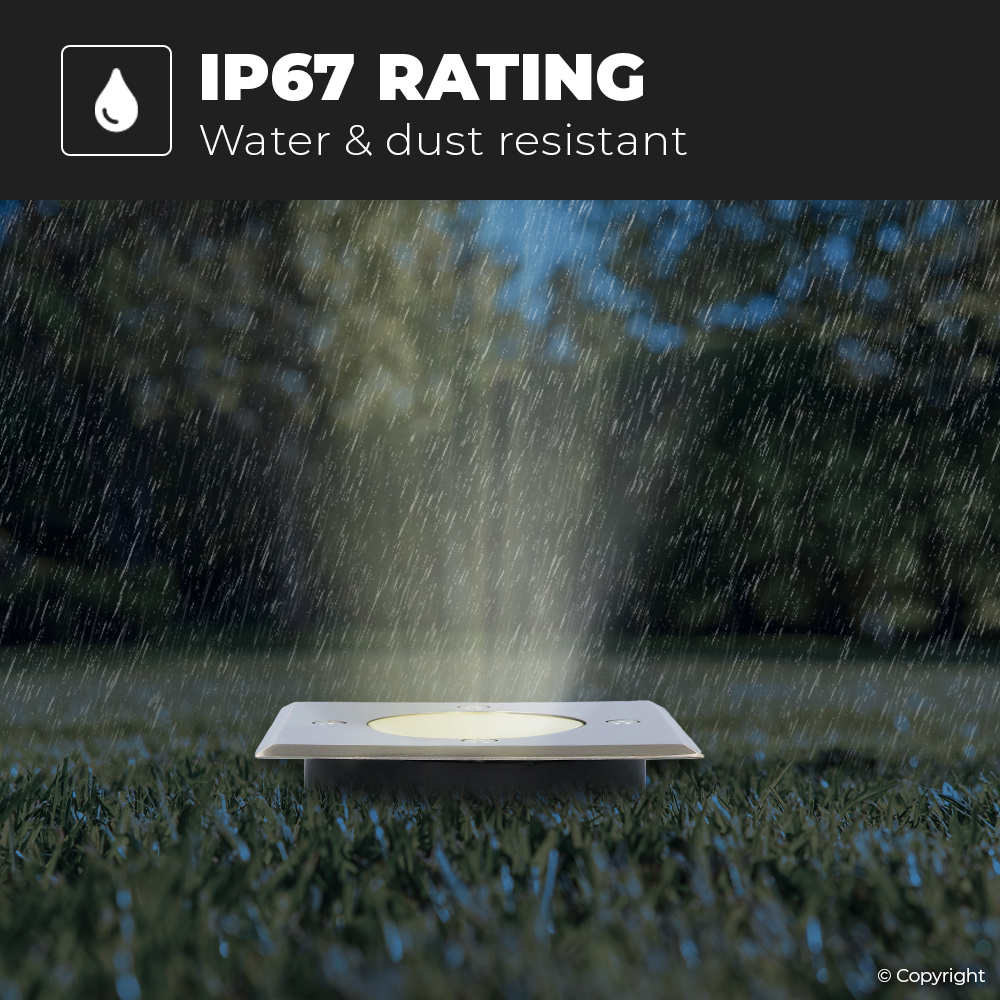Ben je van plan om je tuin te voorzien van keurige sfeerverlichting? Gebruik dan deze keurige grondspots. Deze vierkante grondspots zijn geproduceerd van kwaliteitsmateriaal aluminium, RVS en helder veiligheidsglas. Het laatste dat je wil als je in de tuin aan het borrelen bent, is in het donkerkleurig zitten. Met sfeerverlichting creëer je niet alleen licht maar breng je bovendien stemming. Je kunt tuin of terras naar jouw smaak vormgeven met de juiste verlichting. Belangrijk bij het inrichten van je tuin is het regelen van de plaats: ga voor tuinpaden, de toegang, binnenplaatsen, bomen, planten en verlicht ze met deze inbouw grondspot met IP67 veiligheidsklasse en RVS finish. Door de IP67 beschermingsgraad zijn deze bodemspots waterdicht en afgeschermd tegen de strengste weersinvloeden (niet bruikbaar voor onder water!).