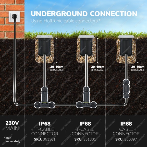 Je kunt heel probleemloos de LED grondspots installeren met meer grondspots. Hiervoor kun je onze waterdichte kabelverbinders gebruiken om de grondspots gezamenlijk te koppelen. (Let op deze zijn niet inbegrepen). Door dit te doen kun je jouw tuin extreem verlichten en mede een mooi nieuw uiterlijk aan je tuin geven. Vind je het handiger om ‘s avonds de lampen te dimmen, dan kan je door middel van dimbare GU10 spots deze grondspots dimbaar maken in combinatie met onze LED dimmers.