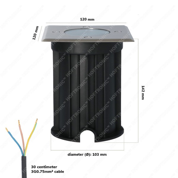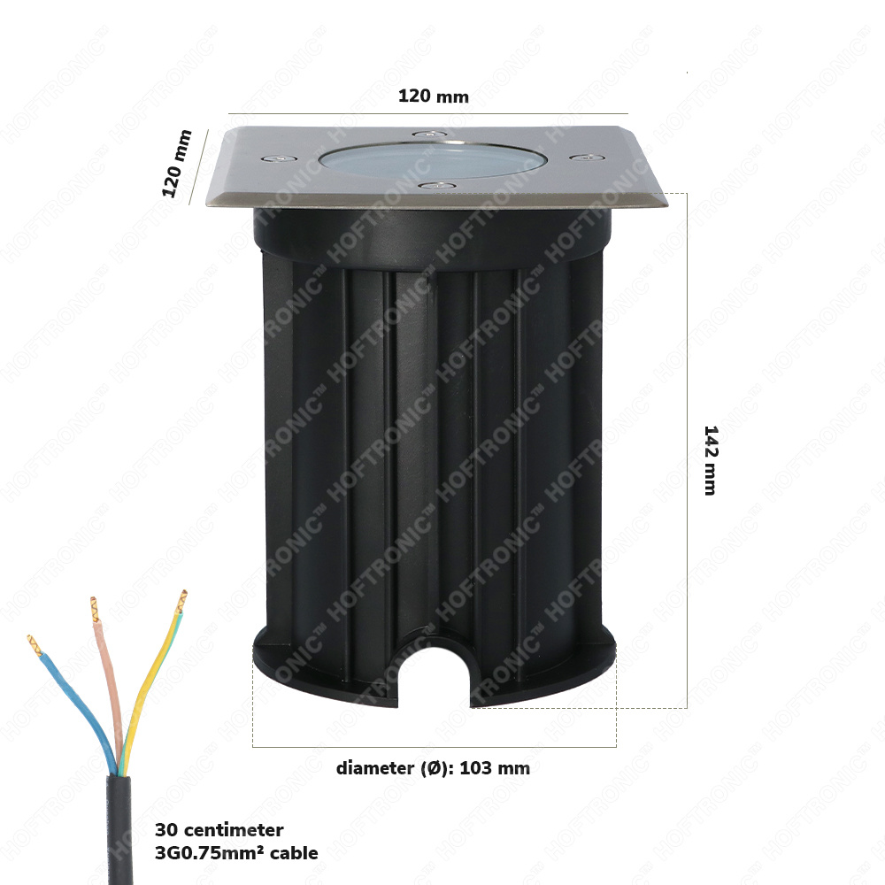 Heb je weinig ervaring met het installeren van verlichting of grondspots? Dan hoef je je geen zorgen te maken: de montage is heel aangenaam. De spot is al voorzien van een GU10 fitting en is reeds aangesloten op een kabel van 30 cm lang. De spot zelf heeft een afmetingen van 120 x 142 x 103 millimeter.