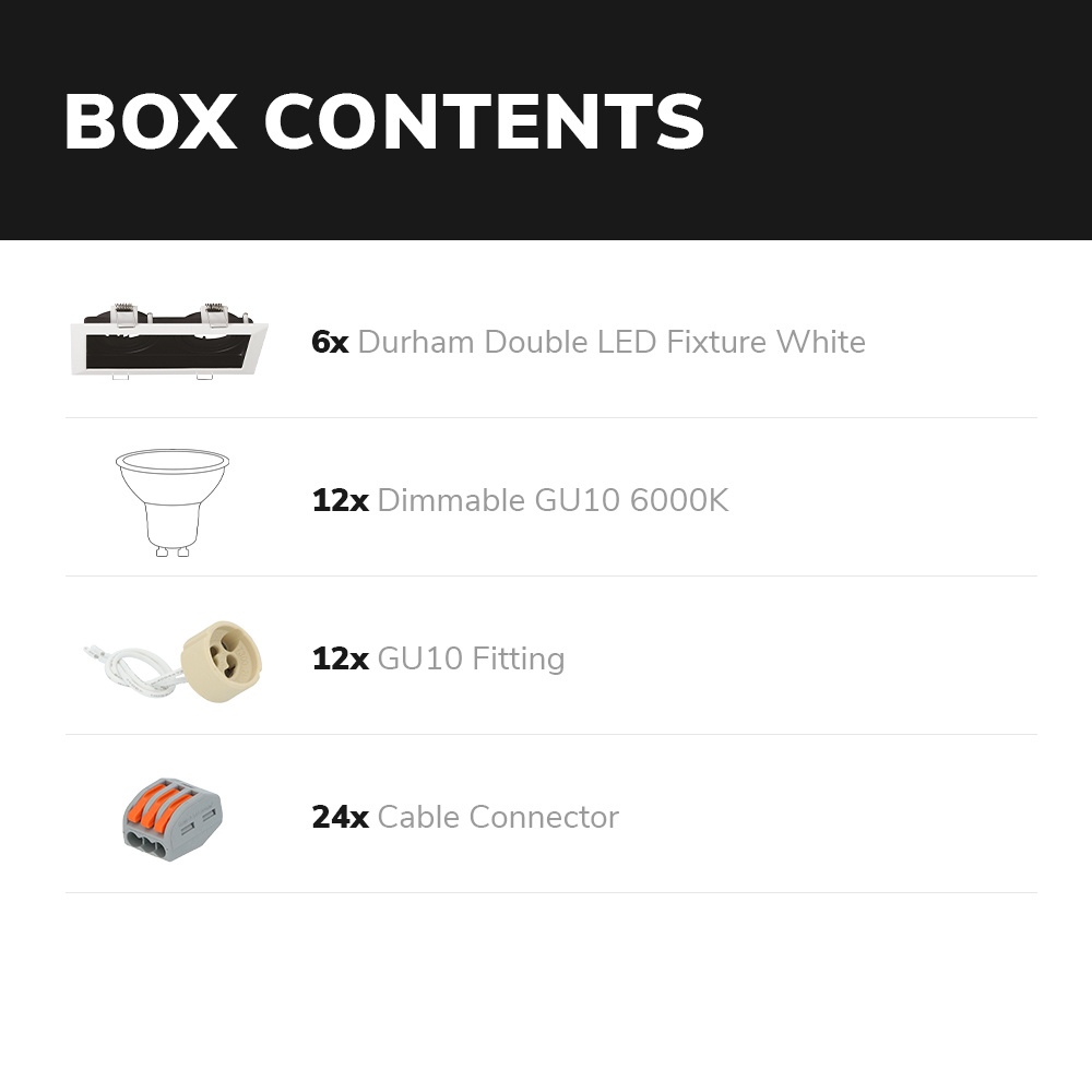 Bij deze Durham Dubbel inbouwspots worden 12 GU10 lichtbronnen met 6000K daglicht wit licht bijgeleverd. Deze lichtbronnen worden vooral voldoende gebruikt als werkverlichting. Deze lichtkleur is vooral lekker in keukens, studeerkamers en gangen.