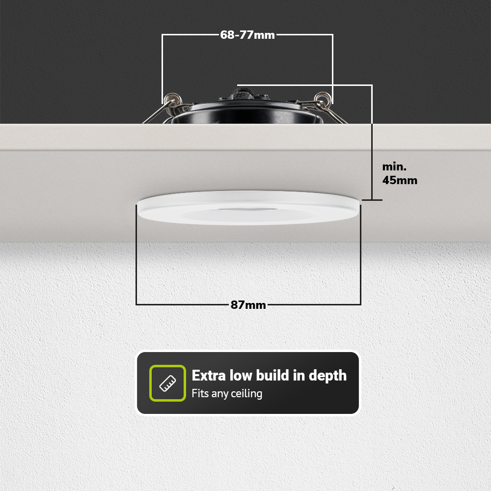 De Venezia heeft een zeer lage inbouwdiepte van slechts 45mm. Hierdoor behoort de inbouwspot comfortabel in de meeste verlaagde plafonds. De zaagmaat doorsnede van de inbouwspot is 65-75 mm. Dit betekent dat de inbouwspot behoort in gaten van 65 tot 75mm. De zeer kleine inbouwdiepte heeft de Venezia te danken aan de geïntegreerde lichtbron.