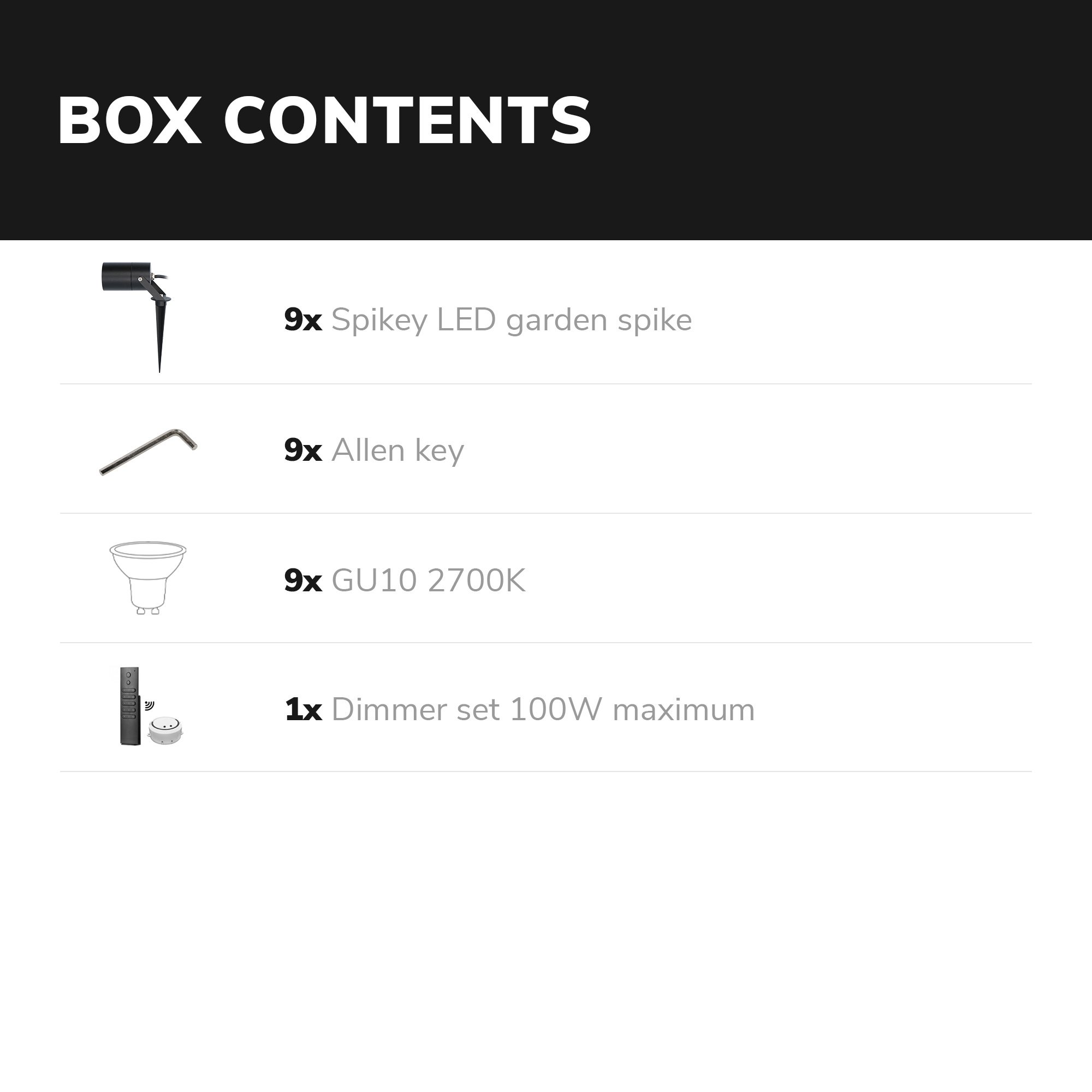 Set van 9 LED Prikspots Spikey – 5 Watt – 400lm – 2700K – zwart – IP65 waterdicht – Incl. dimmer met afstandsbediening