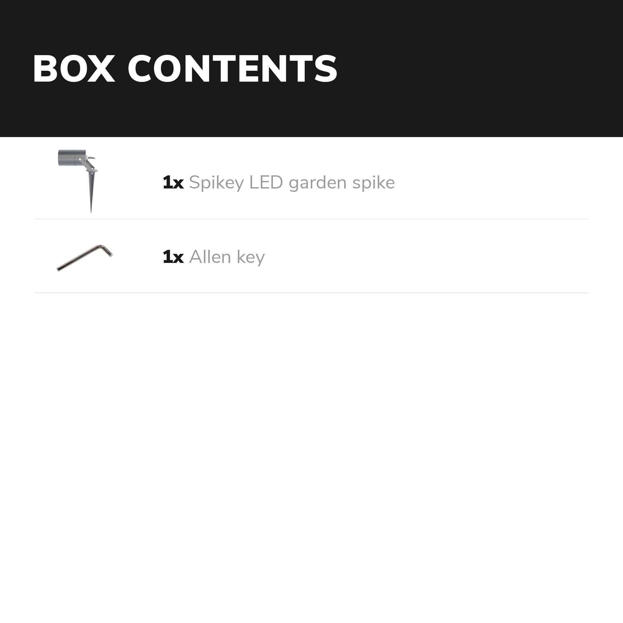 De Spikey prikspot is de tuinverlichting waar je het hele jaar genot van hebt. De IP65 waterdichtheid garandeert een lange levensduur met uitsluiting van prestatieverlies. Het gegoten onderhoudsvrij aluminium met UV-bestendige poedercoating zorgt ervoor dat de spot honderd procent als nieuw blijft. Zelfs wanneer je deze het hele jaar buiten in de regen of zon laat staan of hangen. De strikte Duitse keuring en keurmerken (CE, EMC, RoHS) garanderen een kwaliteitsproduct. Op onze Spikey ontvang je daarom maar liefst 3 jaar garantie!