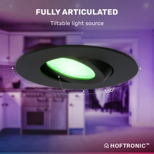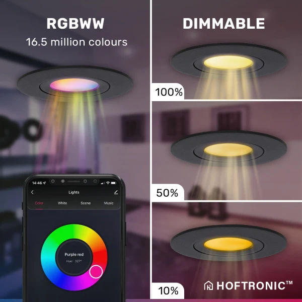 De SMART RGBWW inbouwspot Napels zwart van Hoftronic Smart is een mooi en modern product om je woning, kantoor, firma of in de horeca te van licht voorzien en met de kantelbare armatuur is het mogelijk om het licht naar het gewenste oppervlak te kantelen. Het zijn slimme inbouwspots, wat betekent dat ze te bedienen zijn via je smart items zoals je telefoon of tablet via de kosteloos Hoftronic Smart app. De inbouwspots produceren 16 miljoen uiteenlopende kleuren licht, met daarnaast een warm witte en koel witte lichtkleur. Dit maakt het misschien in elke ruimte een artistieke stemming te creëren.