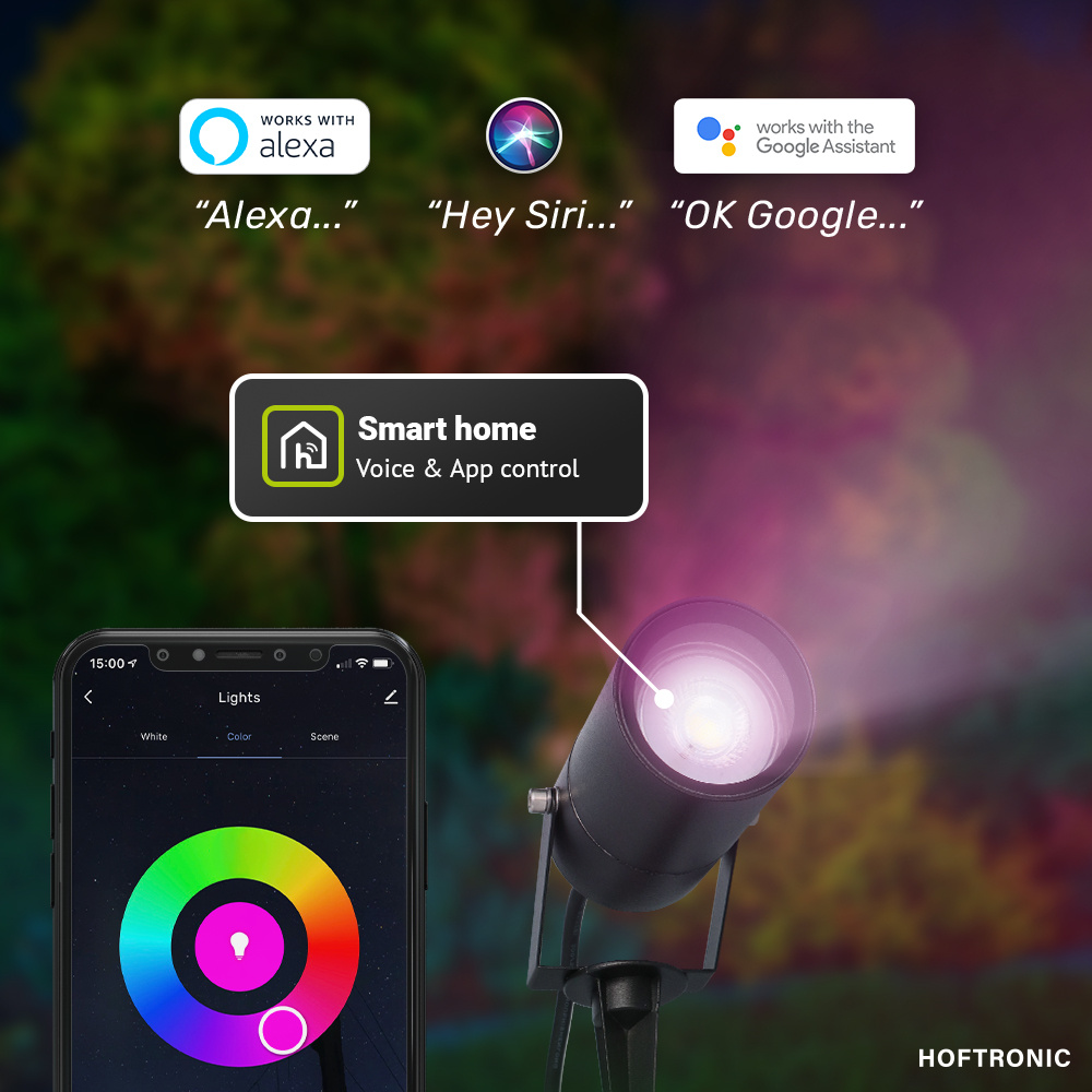 Licht je planten uit op een geweldige aanpak met deze slimme prikspots. De smart Spikey is voorzien van een lichtbron met maar liefst 16,5 miljoen kleuren en tientallen smart functies. Je kunt de Spikey ook koppelen aan je smart assistent, hierdoor kun je de tuinlamp bedienen met je stem. Ondersteunde slimme assistenten zijn: Google Home, Amazon Alexa en Siri.