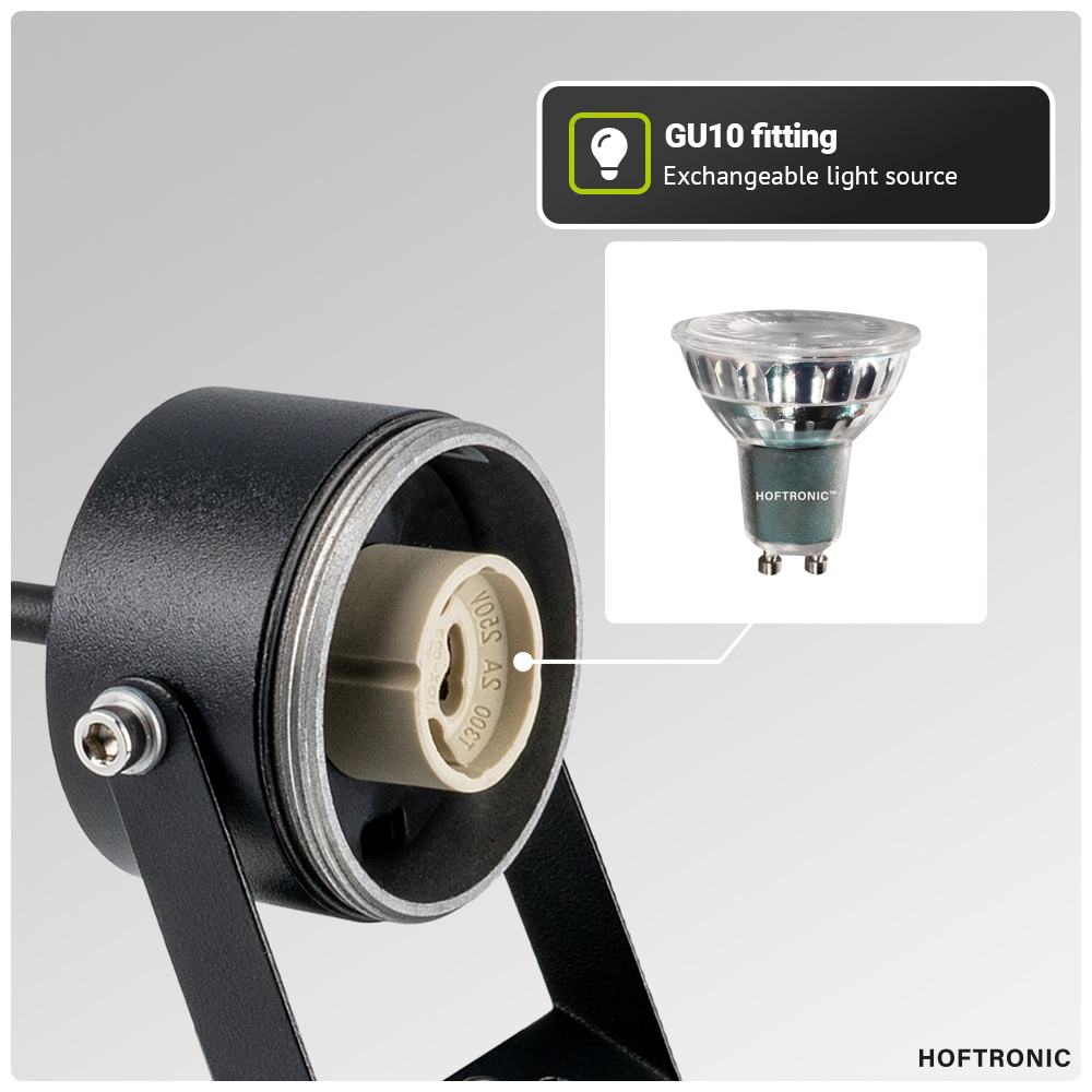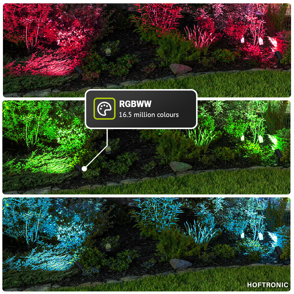 Deze slimme Hoftronic Smart Spikey prikspots beschikken over maar liefst 16,5 miljoen kleuren en alle wit tinten (2700K – 6500K). Er is dus altijd wel een lichtkleur die behoort bij jouw situatie en gevoel. Zet de spots op rood voor een romantisch op het terras of zet de GU10 spots op blauw wanneer je geschikt licht nodig hebt in de tuin.