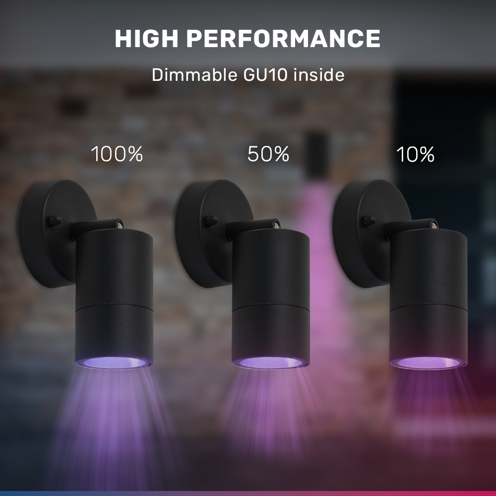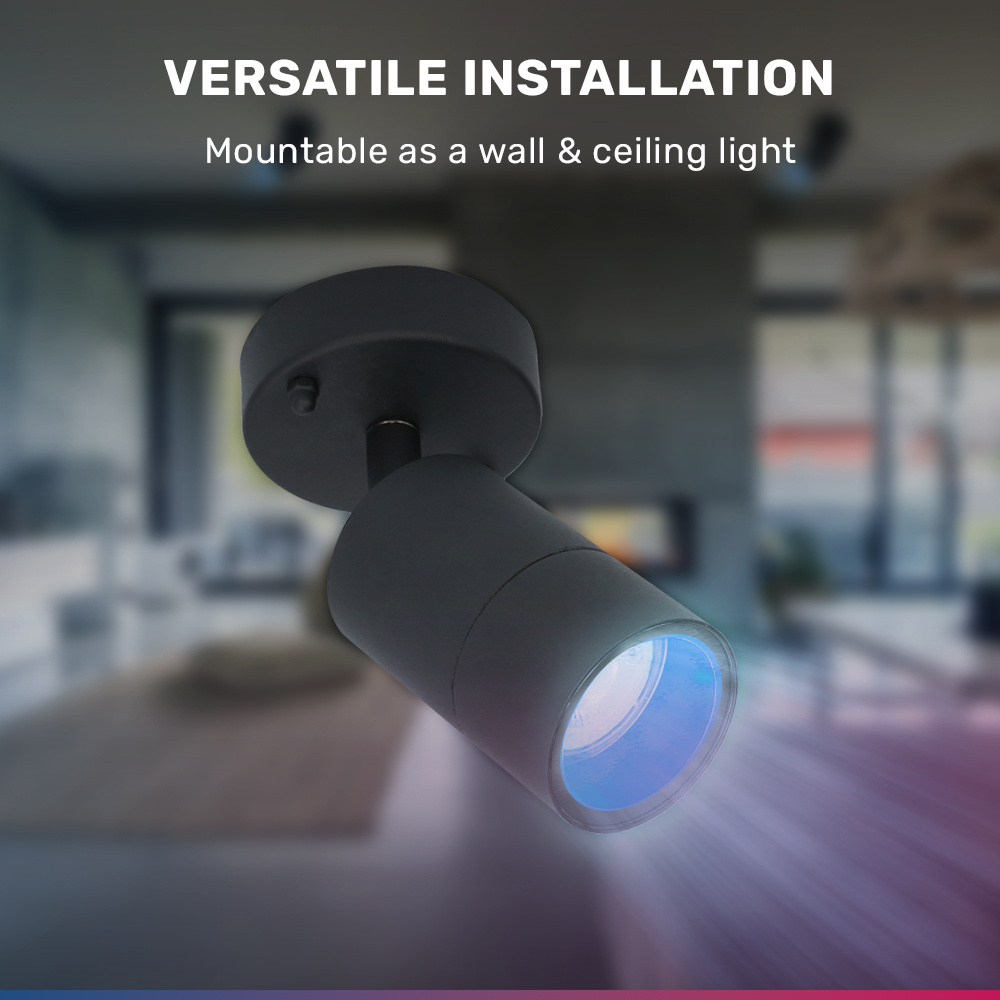 Kantelbare Lago spotlight in zwarte kleur met Smart RGBWW GU10 spotje, bruikbaar als stijvolle wandlamp of plafondspot met IP44 spatwaterbestendigheid voor in huis en buiten