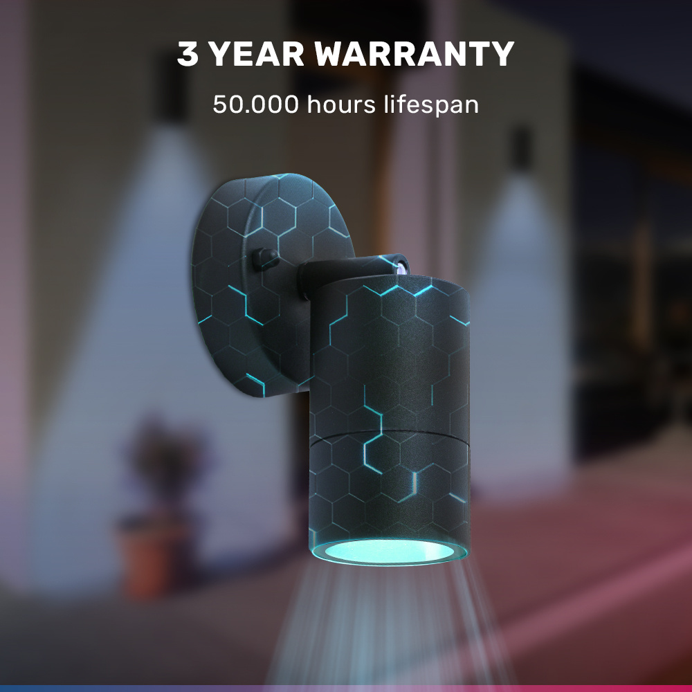 Deze zwarte LED spotlights hebben hun mat zwarte kenmerk te danken aan een krasbestendige poedercoating. Deze coating waakt ervoor dat de spotjes niet verkleuren. Hierdoor ben je verzekerd van jarenlang amusement van deze Lago wandspot! Door de combinatie van het onderhoudsvrije aluminium en krasbestendige coating, geven wij maar liefst 3 jaar waarborg op het armatuur.