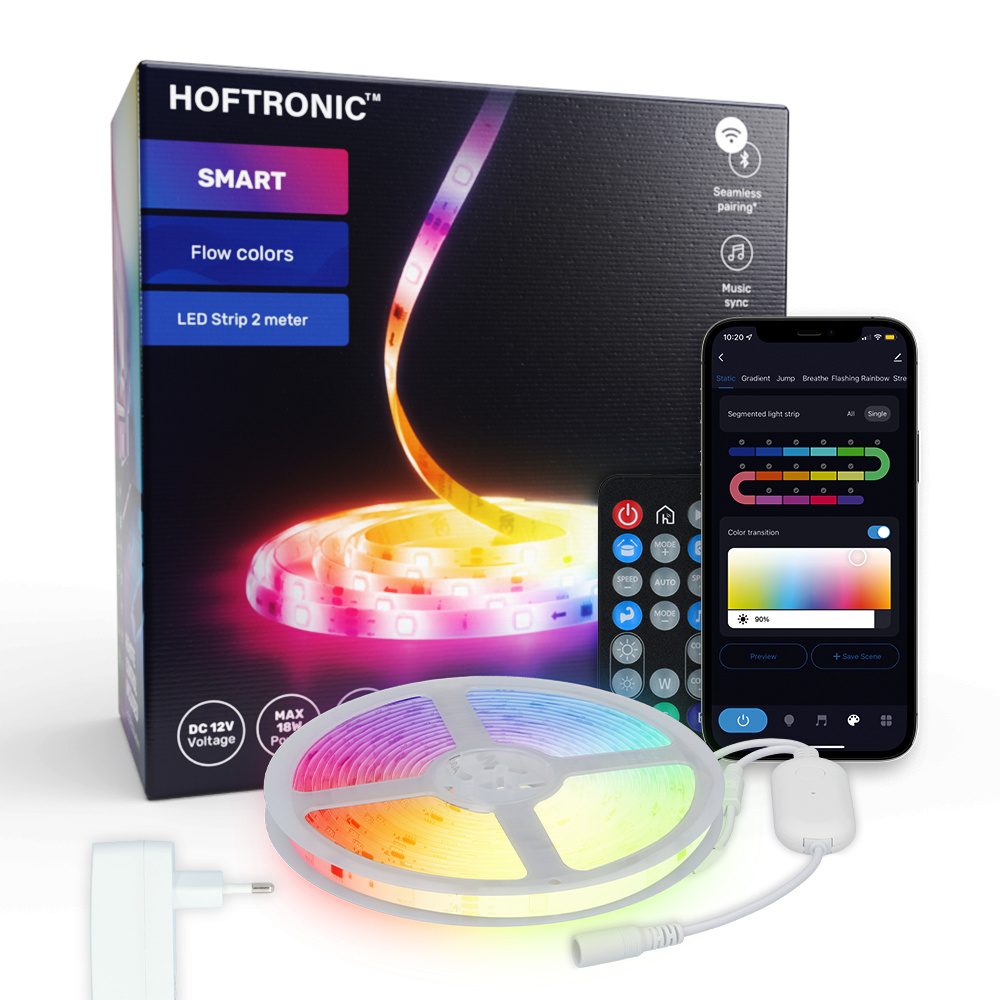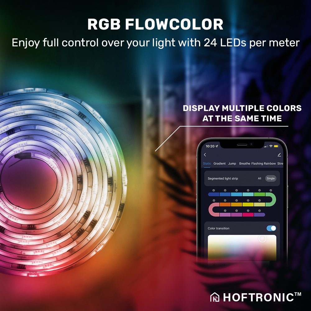 Deze Flow Color LED Strips zijn van het merk HOFTRONIC. HOFTRONIC is zowel verkoper als fabrikant van LED verlichting. Hierdoor profiteer je van de scherpste prijs, de hoogste kaliber en de belangrijkste garantievoorwaarden. Op deze smart LED strip ontvang je dan mede 2 jaar garantie. Defecten worden binnen deze twee jaar altijd kosteloos afwisselen.
