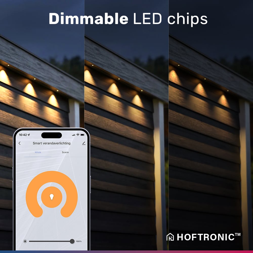 Breng warme sfeerverlichting aan in je uitbouw met deze volle set zwarte Milano Smart LED inbouwspots. Deze set bevat 4 mini Cree LED inbouwspots van 3 watt. De inbouwspots hebben een warm witte lichtkleur van 2700K en een lichtsterkte van 200 lumen waarmee je de overmatige ambiance kunt creëren. Door de beschermingsklasse van IP65 zijn de smart LED-inbouwspots waterdicht waardoor ze niet alleen juist zijn voor buiten, maar voor elke natte ruimte onder andere de badkamer. De driver van de mini inbouwspots verbind je via Wifi of Bluetooth gemakkelijk met je smartphone of tablet waardoor je kunt genieten van tientallen smart functies, zoals smart assistent, timers, geofencing, schemerschakelaar en meer. De set wordt verder bezorgd inclusief transformator, verdeler en 5 meter kabel per inbouwspot. Deze set is tevens leverbaar als set van 6, 8, 10 en 12 spots.