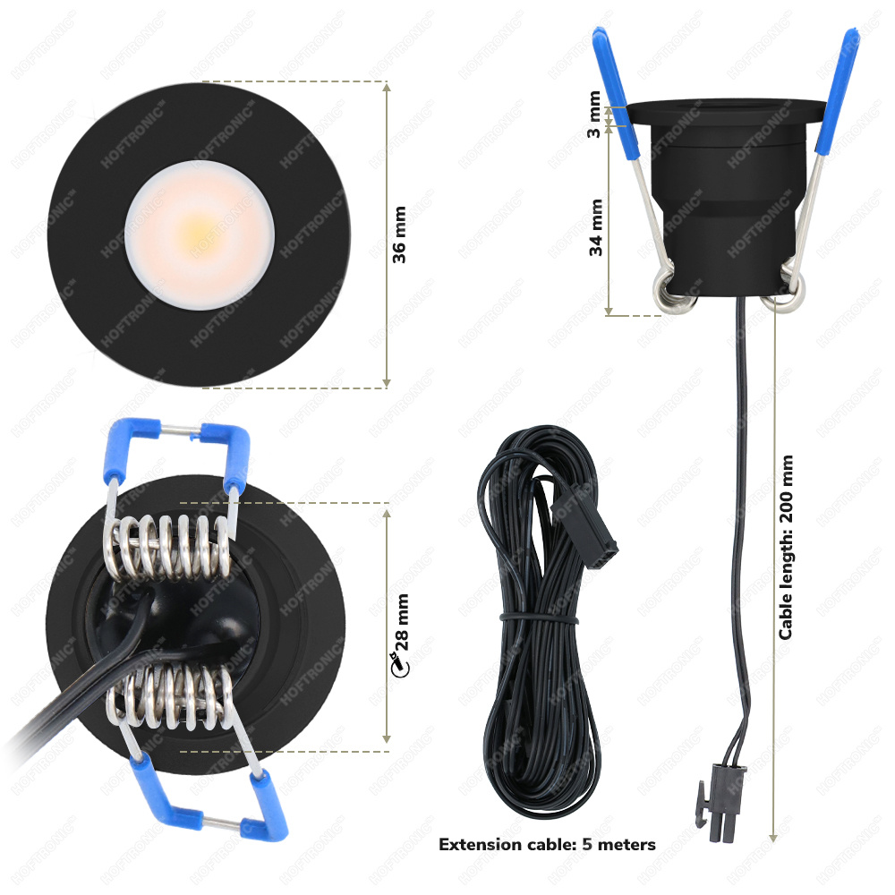 Deze Milano Cree LED spots zijn voorzien van een Plug & Play stekkerverbinding wat het installeren tot kinderspel maakt. De inbouwspots hebben klemmen waardoor ze moeiteloos te plekken zijn. De transformator is aan de 230V zijde voorbereid met een 15 centimeter lange kabel. Deze kun je onmiddelijk op de netspanning aansluiten of er een netsnoer van de gewenste grootte op aansluiten. De spotjes beschikken over een 5 meter lange kabel met AMP-connectoren (deze lijken op bondige internetkabel-aansluitingen). Deze prik je probleemloos en afgezien van goederen in de slimme driver. Heb je meer kabel nodig? Dan kun je de kabels comfortabel verlengen met een aanvullende verlengkabel van 2 of 4 meter. Deze klik je op dezelfde manier aan de aansluitkabels van de inbouwspots.