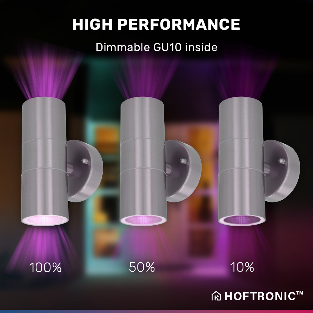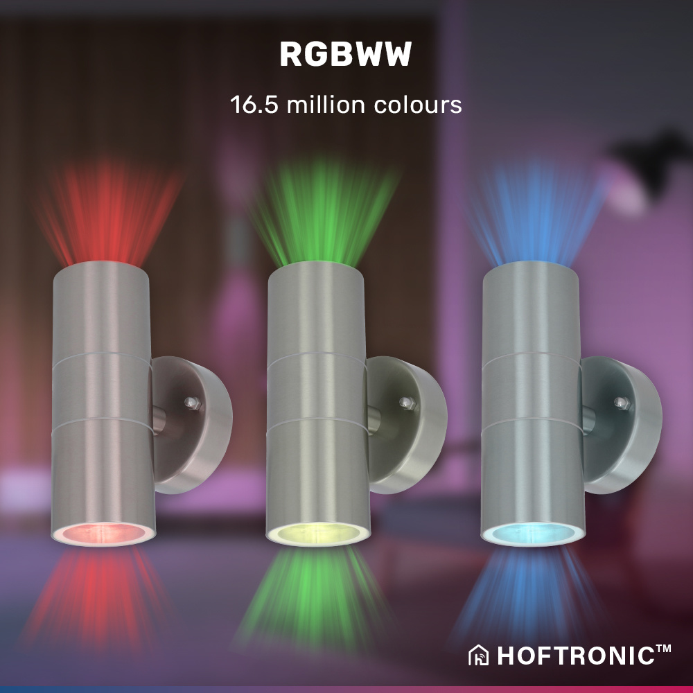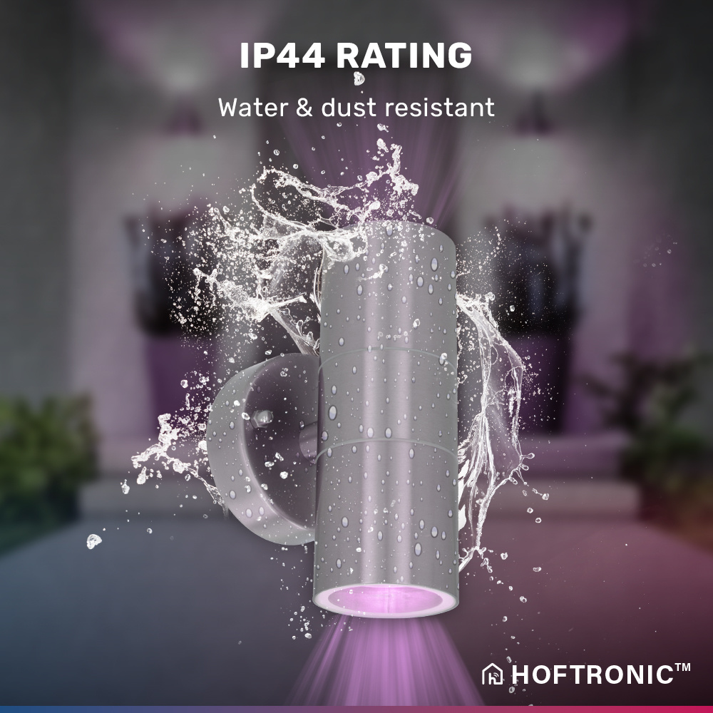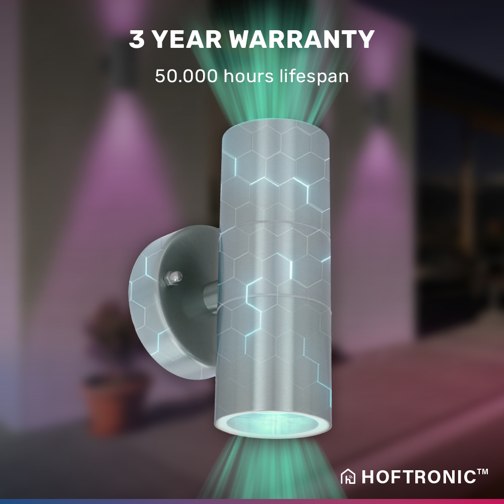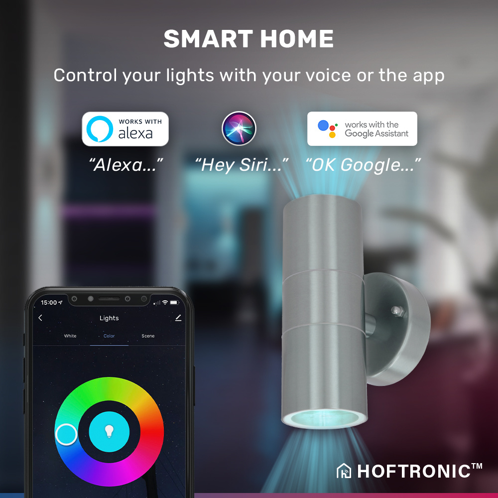 Deze Jasmin Up and Down wandlamp is voorzien van twee slimme lichtbronnen. Deze lichtbronnen kunnen in maar liefst 16,5 miljoen kleuren licht schijnen. Door de Jasmin aan je WiFi netwerk (en de kosteloos Hoftronic Smart app) te koppelen kun je deze bedienen met je smartphone. Ook kun je de wandlamp koppelen aan je slimme assistent. Hierdoor kun je de buitenverlichting zelfs met je stem bedienen. De Jasmin is IP44 waterdicht en ontworpen van onderhoudsvrij aluminium. Hierdoor kun je de wandlamp in huis en buiten gebruiken.