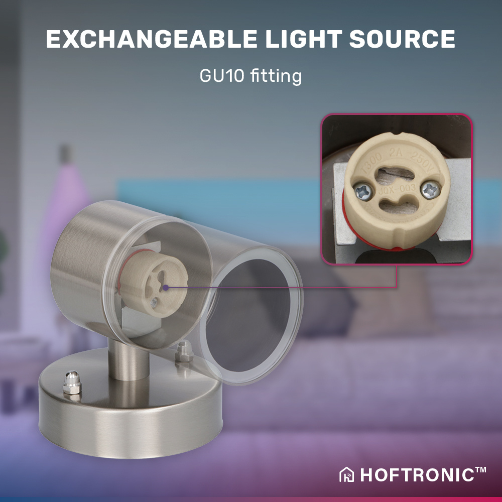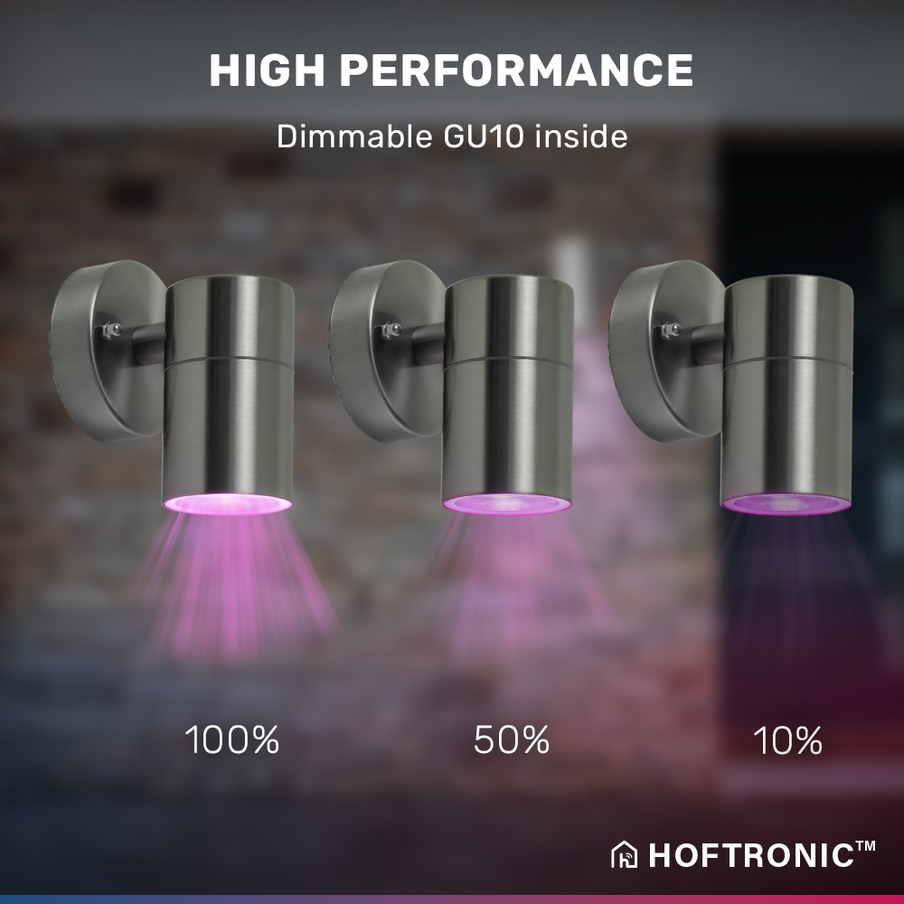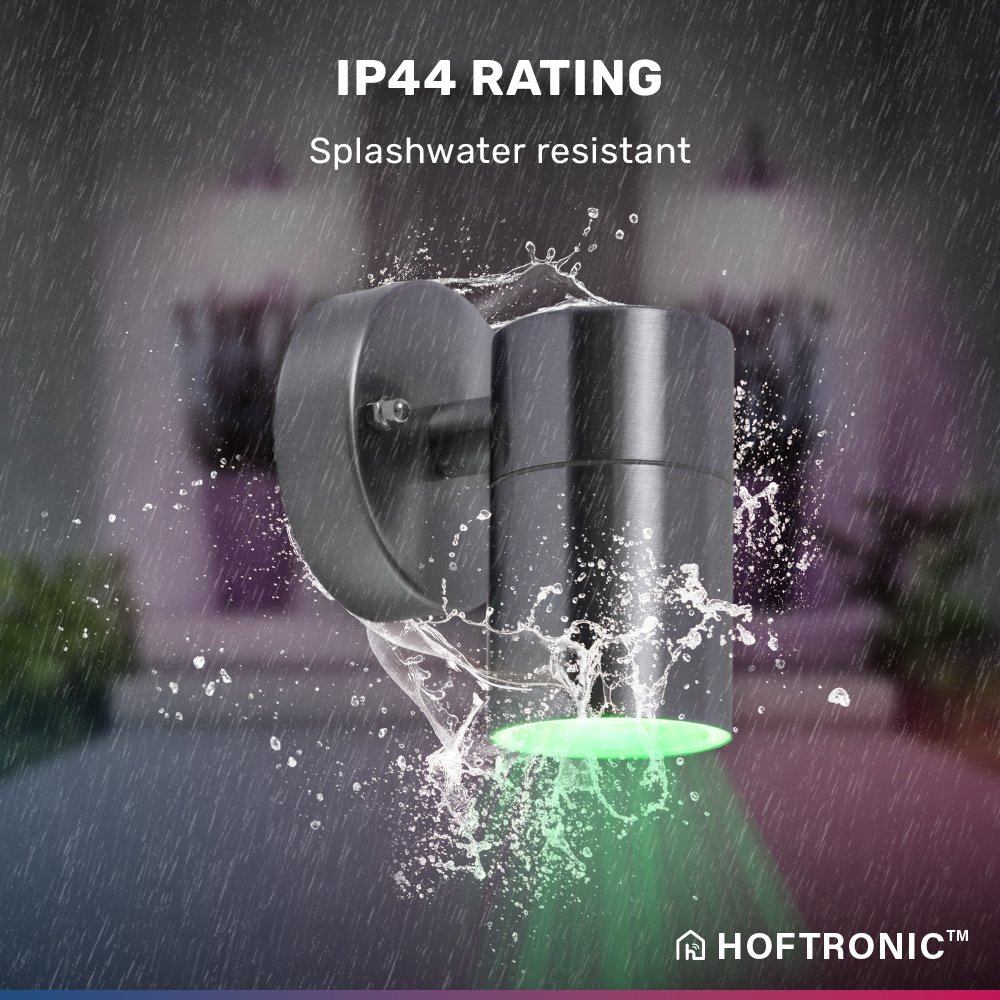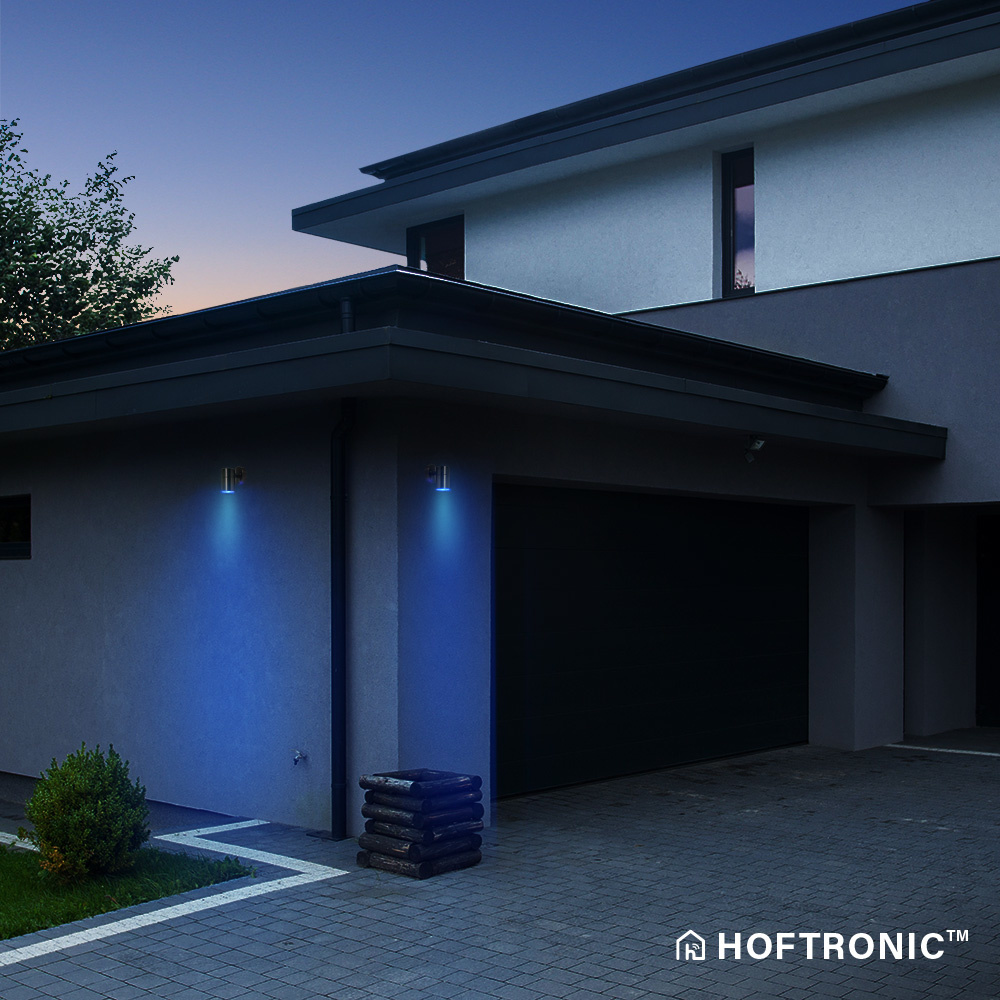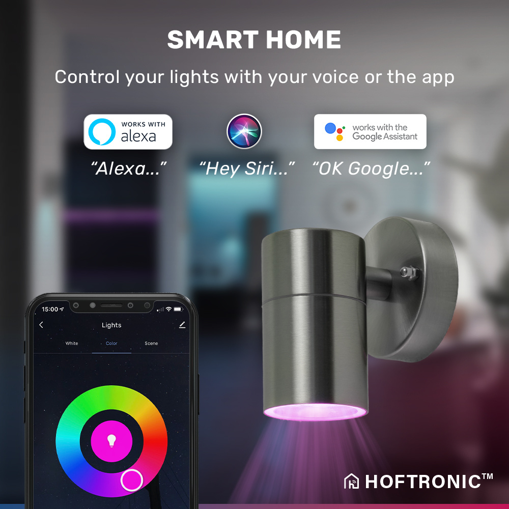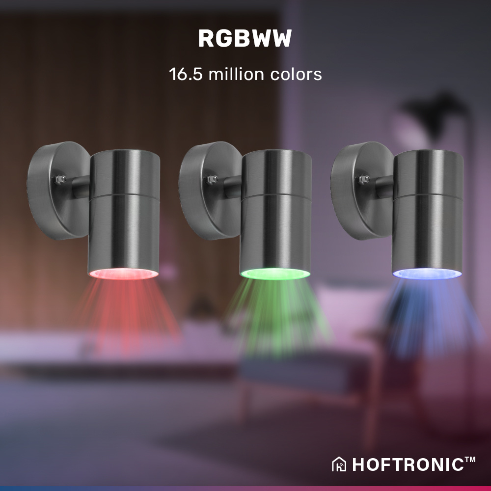 Deze smart WiFi LED lampen voor aan de muur zijn eenzijdig oplichtend en verbruiken slechts 5.5 Watt (vervangt 50 Watt) per spot en is IP44 waterbestendig. Deze slimme RGBWW LED spots kunnen in 16 miljoen uiteenlopende kleuren veranderen evenals warm wit en koel wit. Door zijn elegante cilindervorm is deze buitenverlichting een echte must-have. De LED lichtbronnen zijn slimme items, wat betekent dat ze te koppelen zijn aan andere slimme spullen. Via de WIFI zijn ze koppelbaar aan je telefoon of tablet, en via de Hoftronic Smart App kun je de spots probleemloos bedienen, waar en wanneer je wilt zolang de spots met WIFI verbonden zijn.